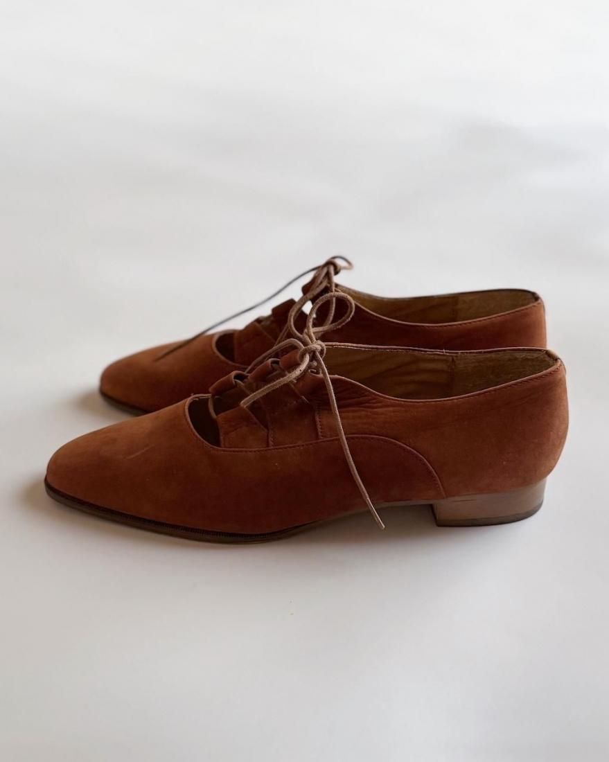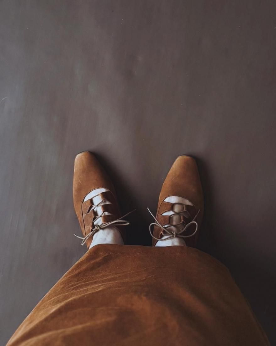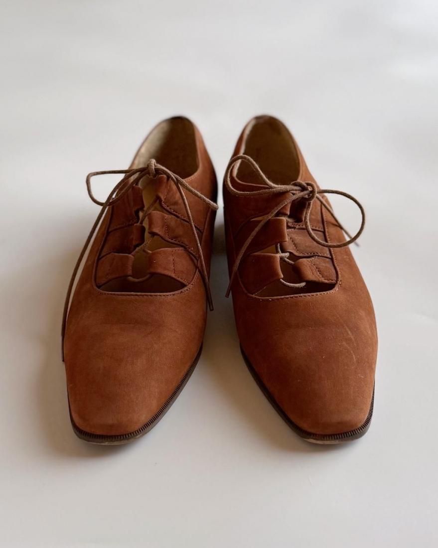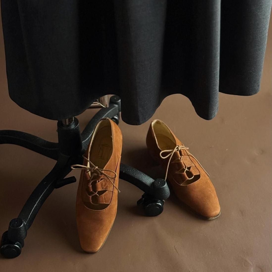 濃いめのブラウンスウェードカラーとクラシックなレースアップデザインが今の気分にぴったりなギリーシューズ。