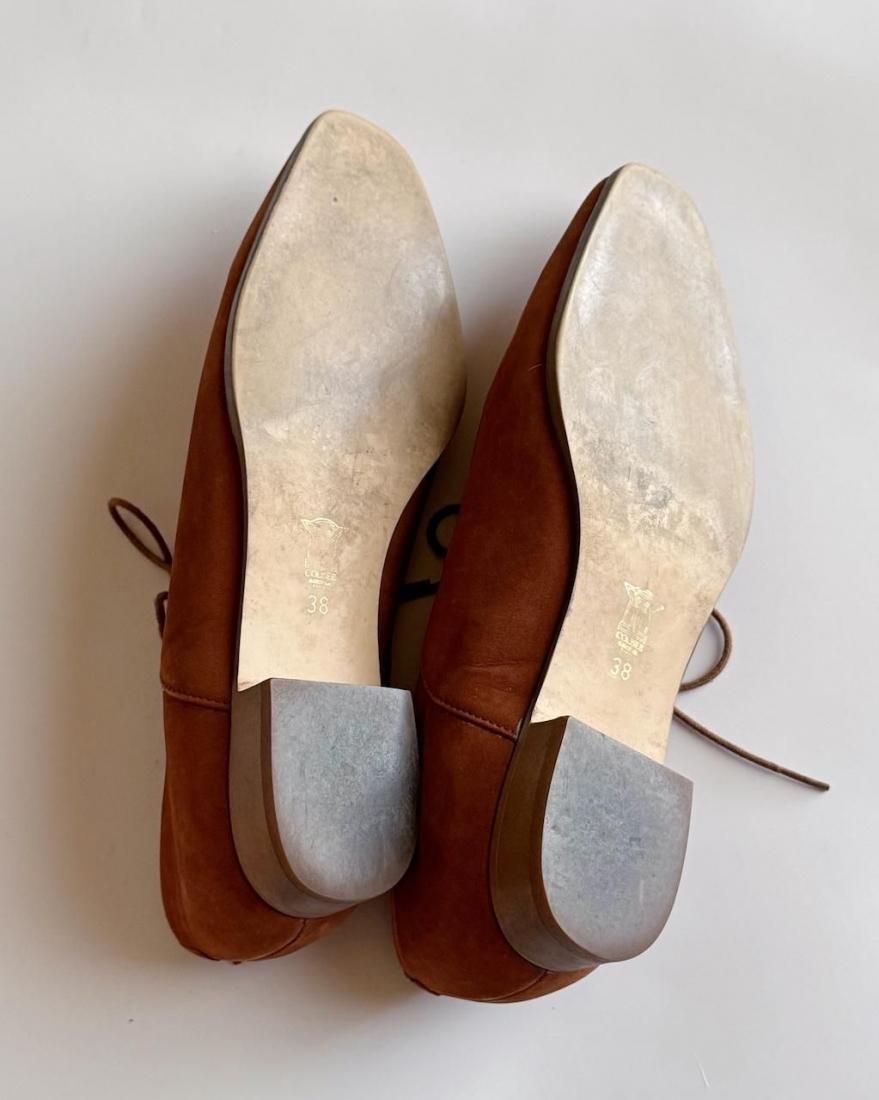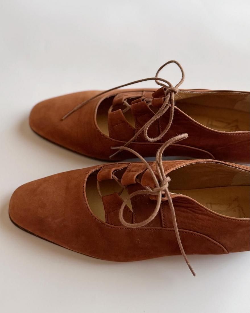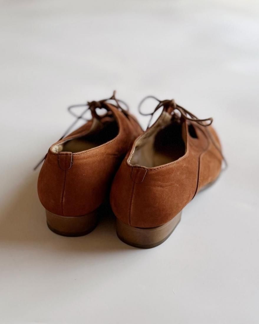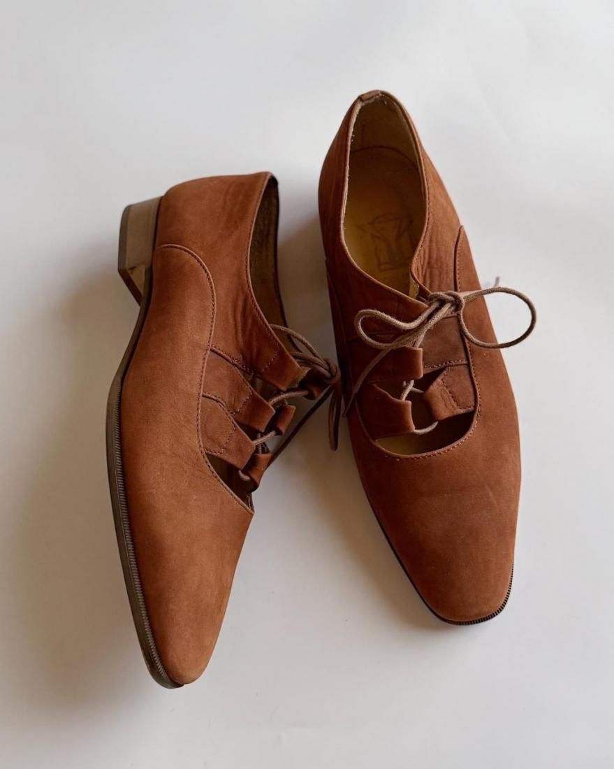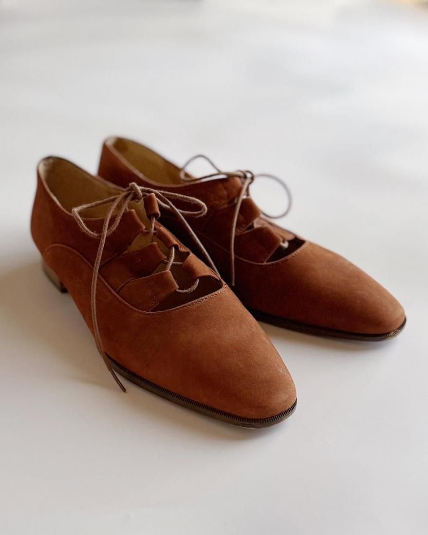 濃いめのブラウンスウェードカラーとクラシックなレースアップデザインが今の気分にぴったりなギリーシューズ。