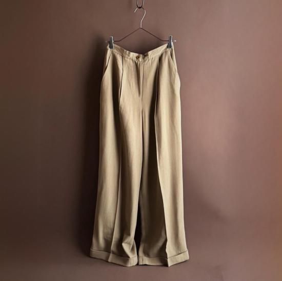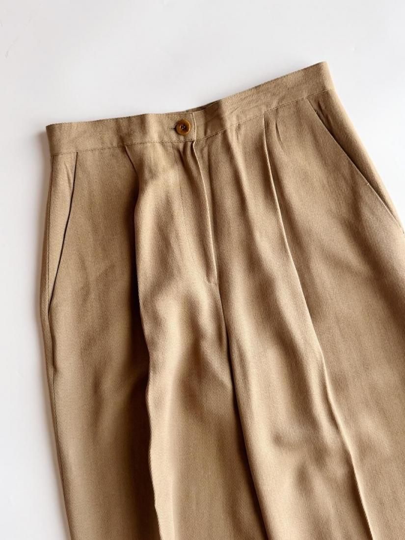 サマーウールのようなやや薄手の風合いで通年ご使用いただけそうな、ブラウンカラーのスラックスパンツ。