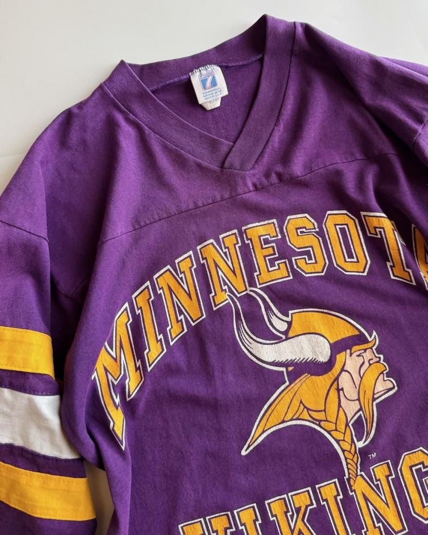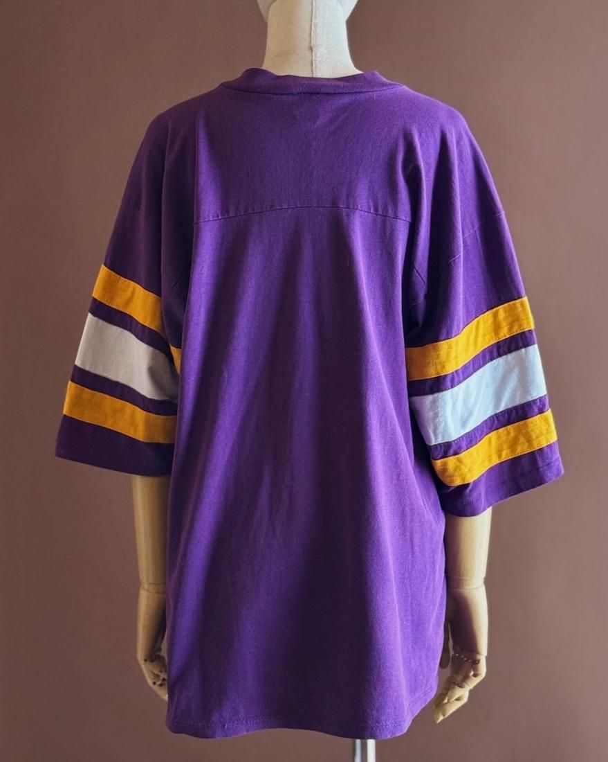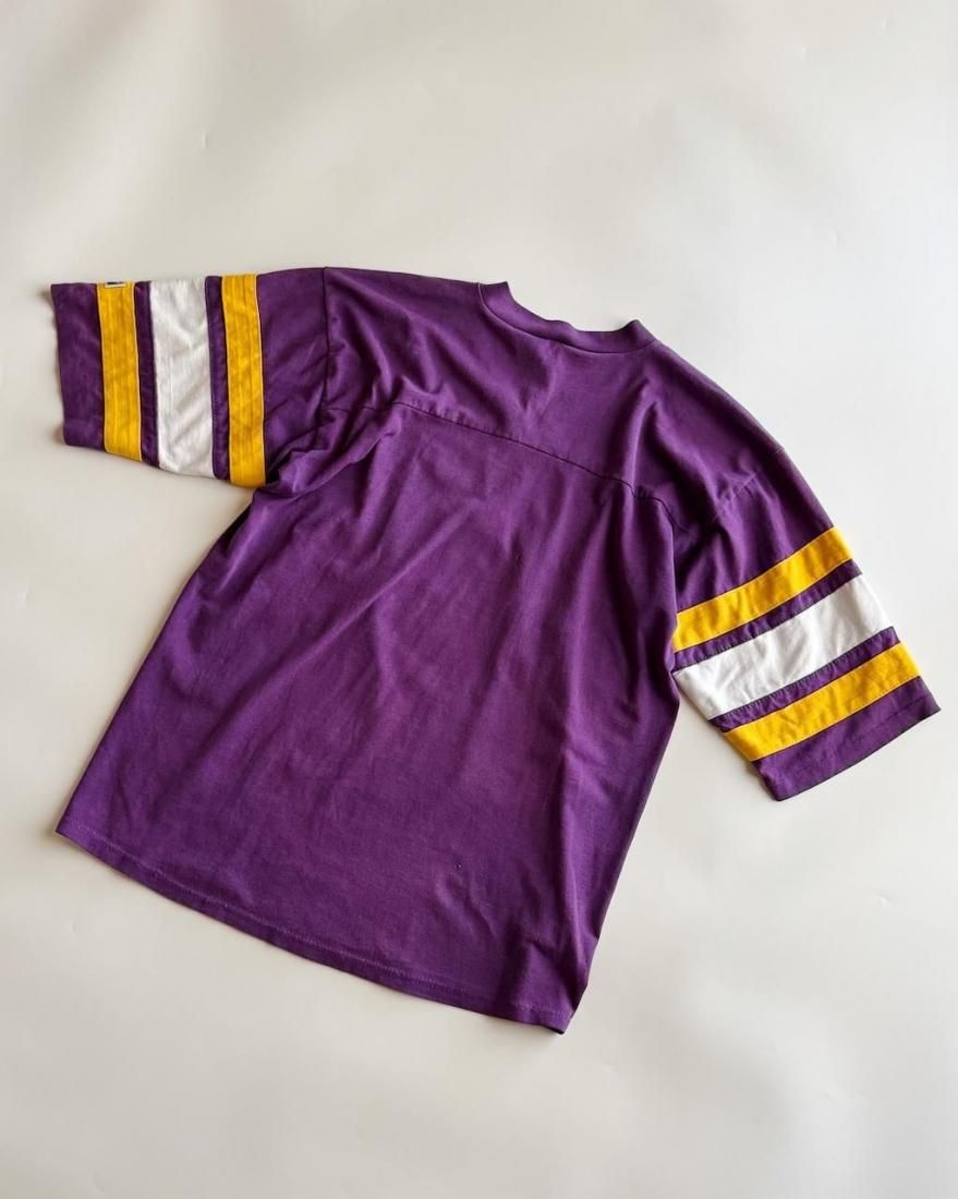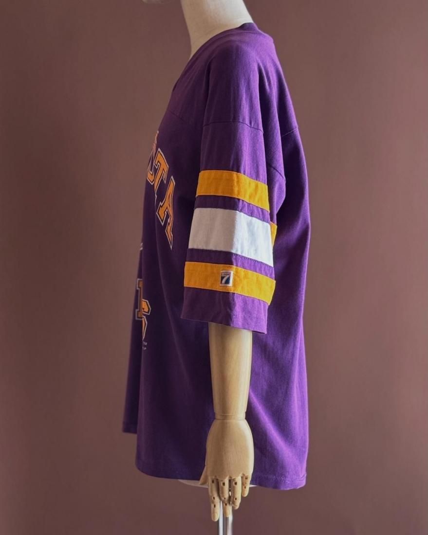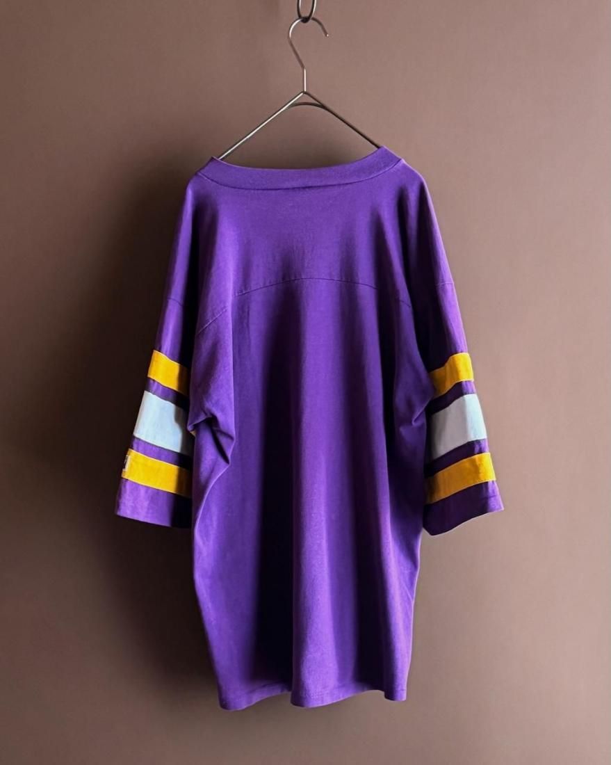 濃いパープルカラーにイエロー、ホワイトの配色、バイキングのプリントがカッコいいフットボールTシャツ。