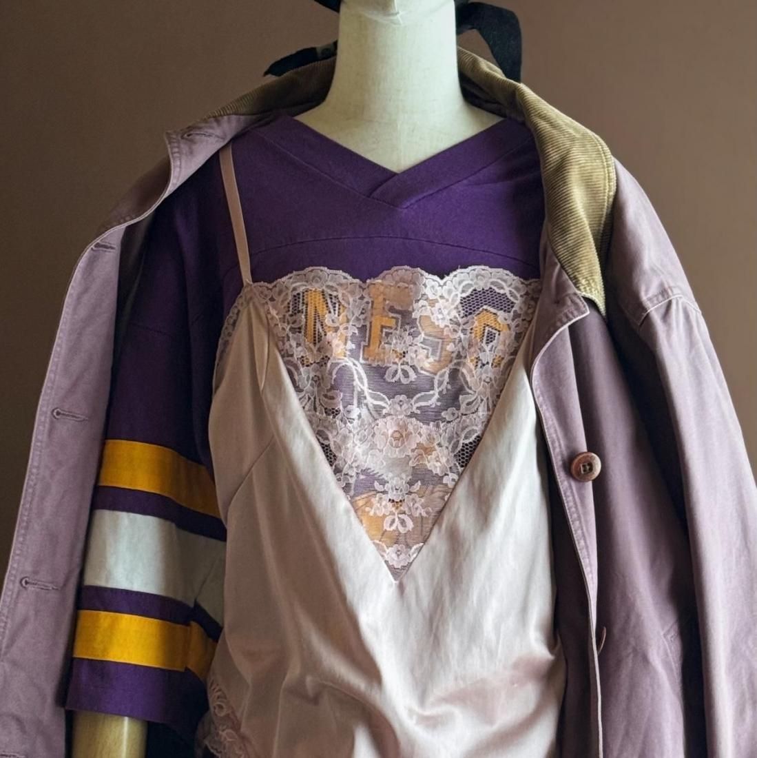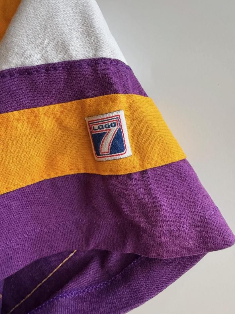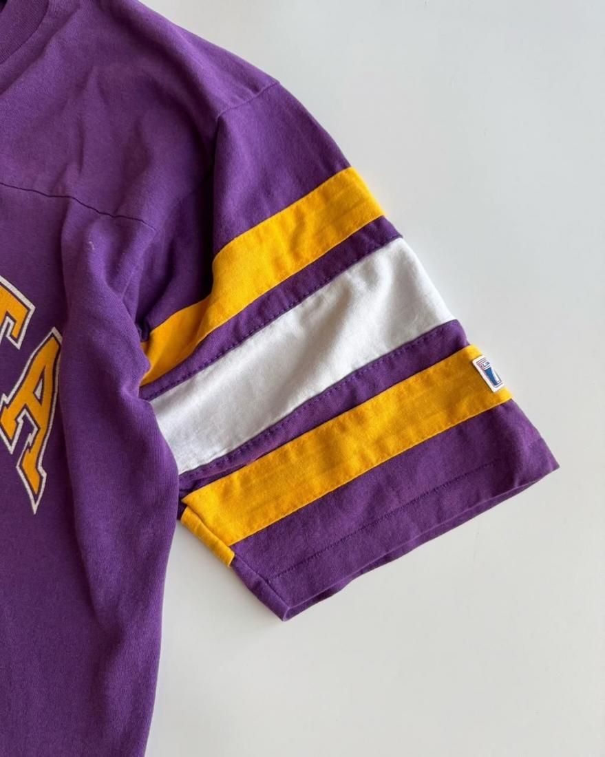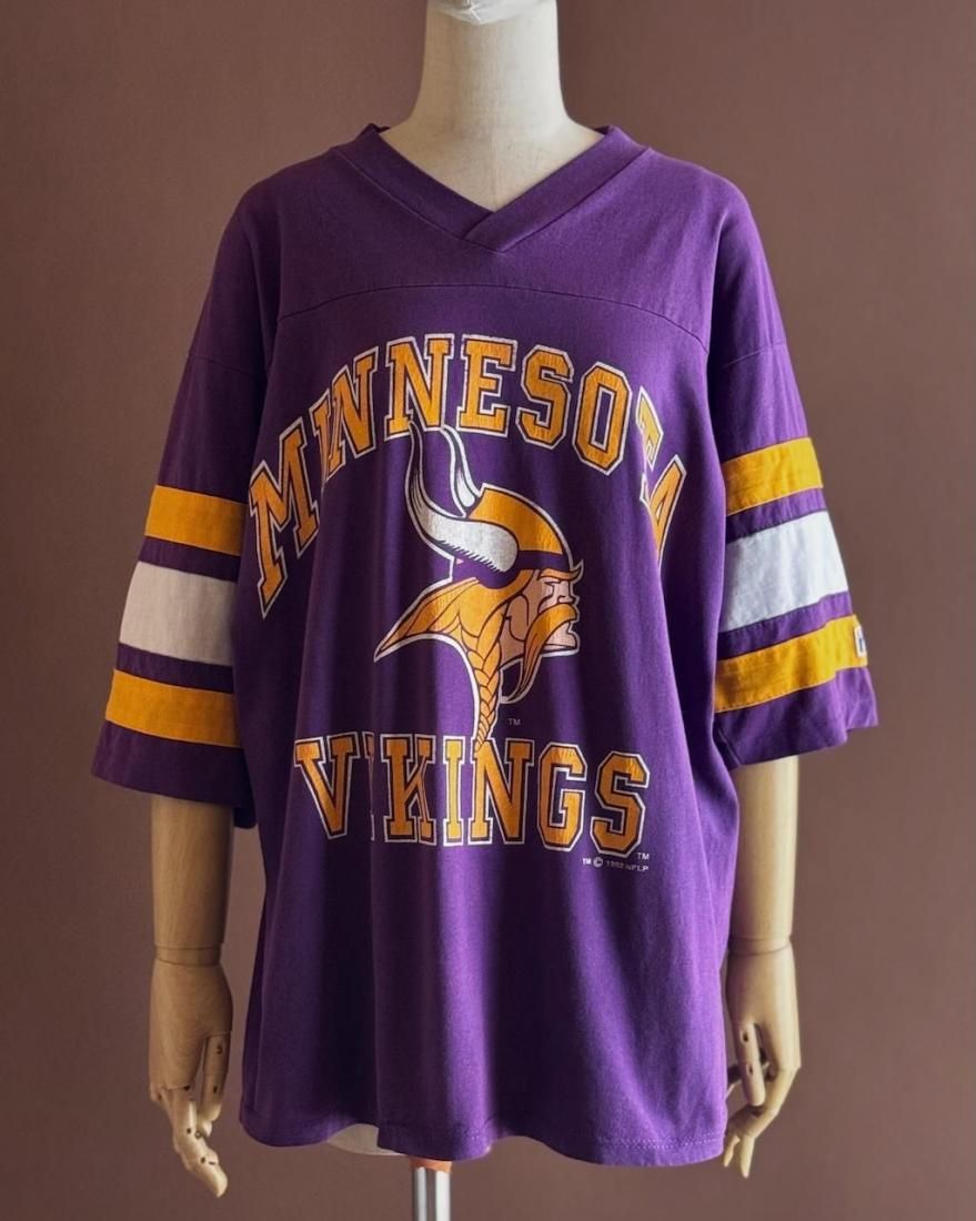 濃いパープルカラーにイエロー、ホワイトの配色、バイキングのプリントがカッコいいフットボールTシャツ。