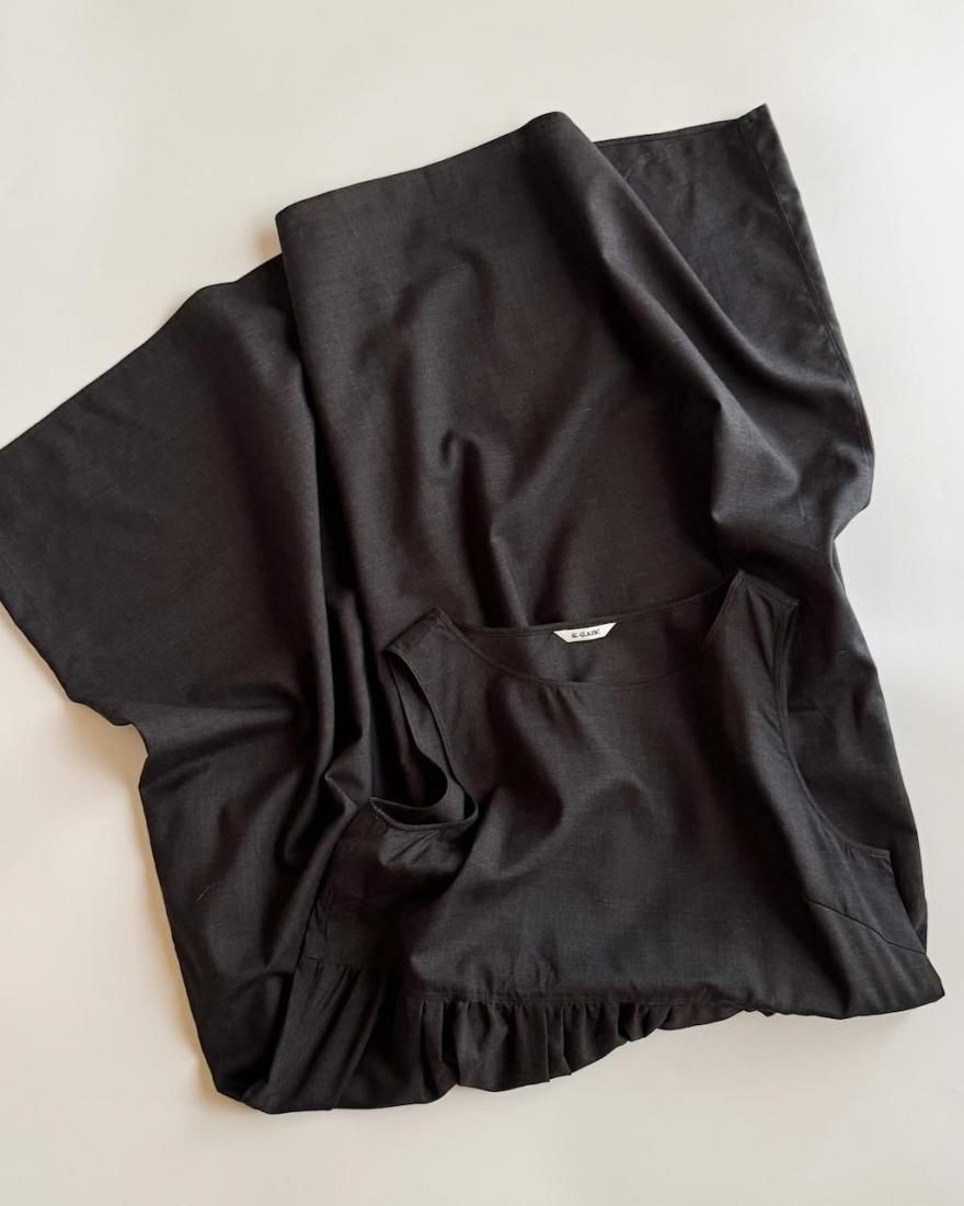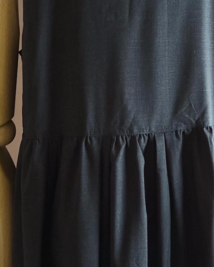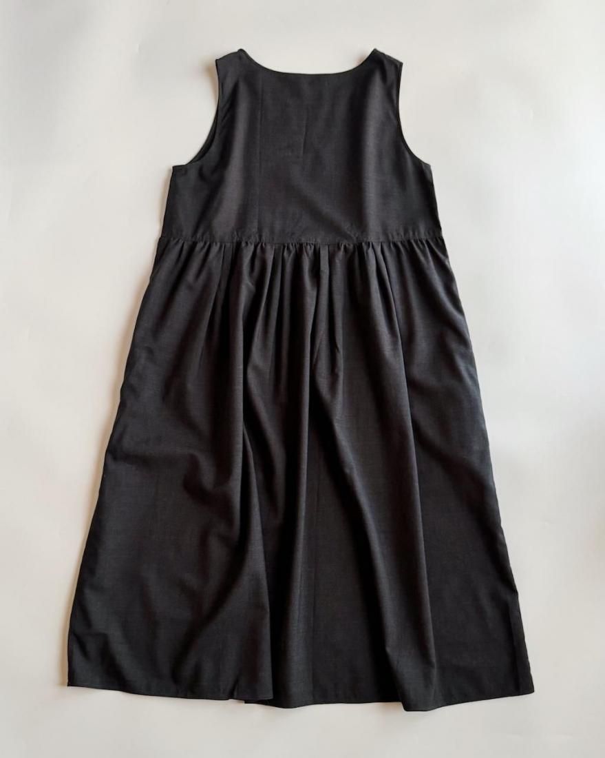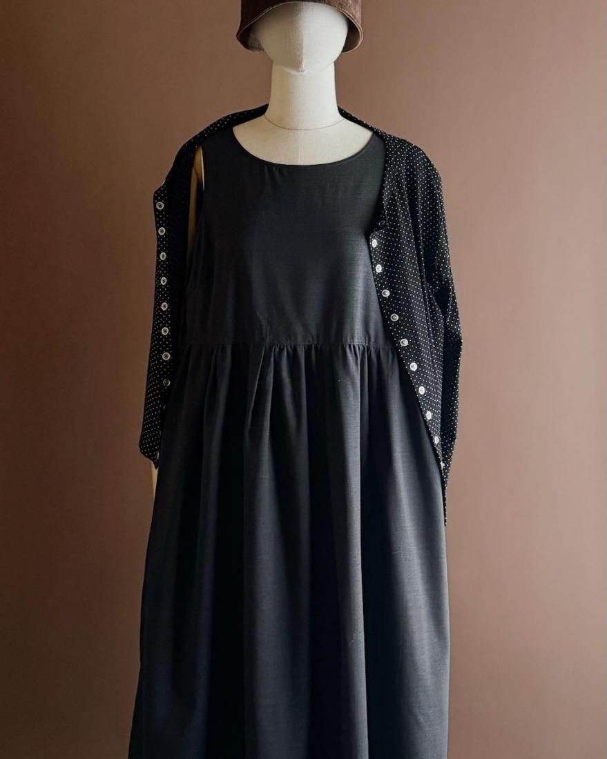 ウエストギャザーの女の子らしいシルエットながら、ダークグレイカラーでマニッシュな雰囲気も兼ね備えた、大人の女性に着て欲しい一枚。