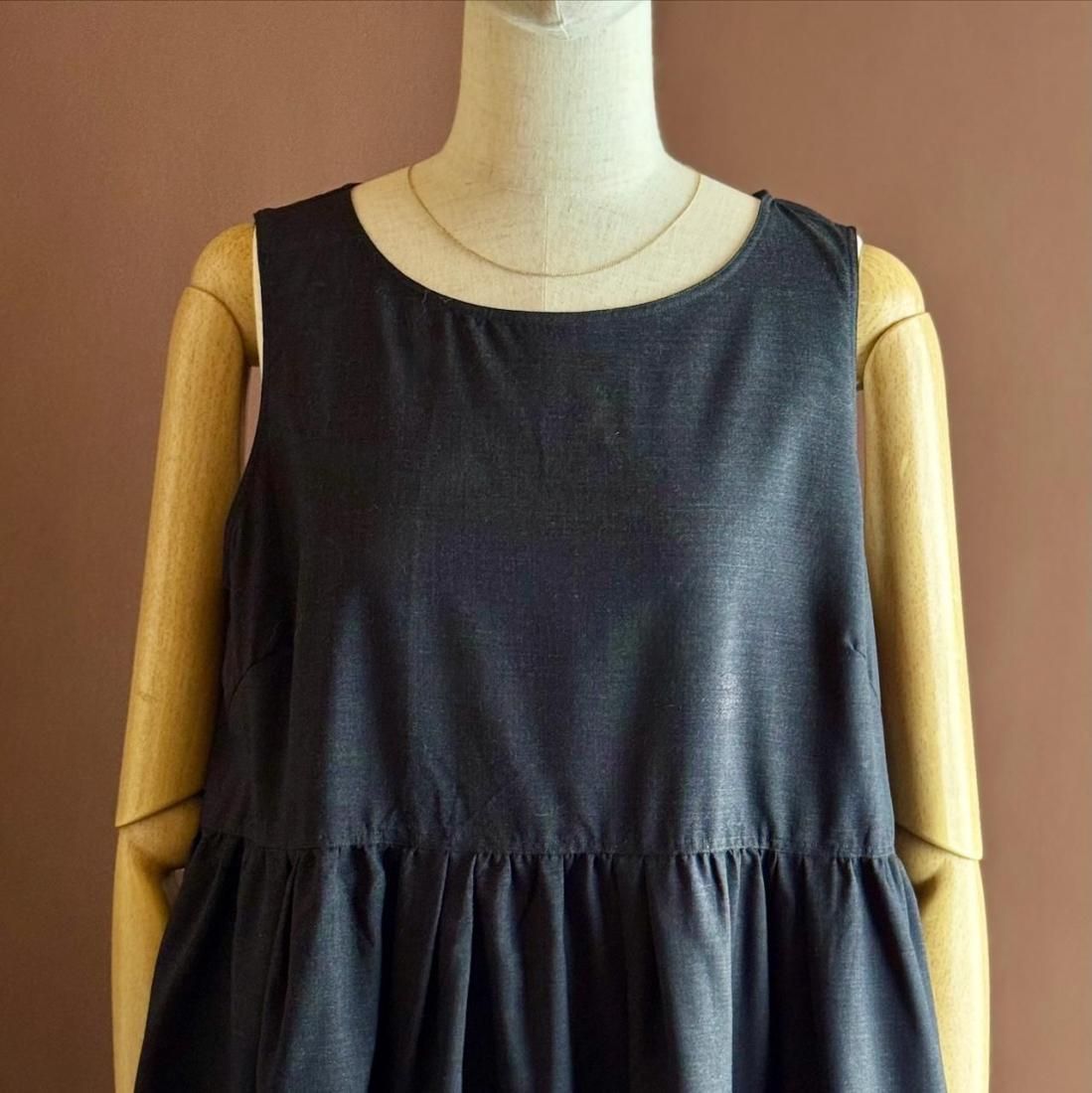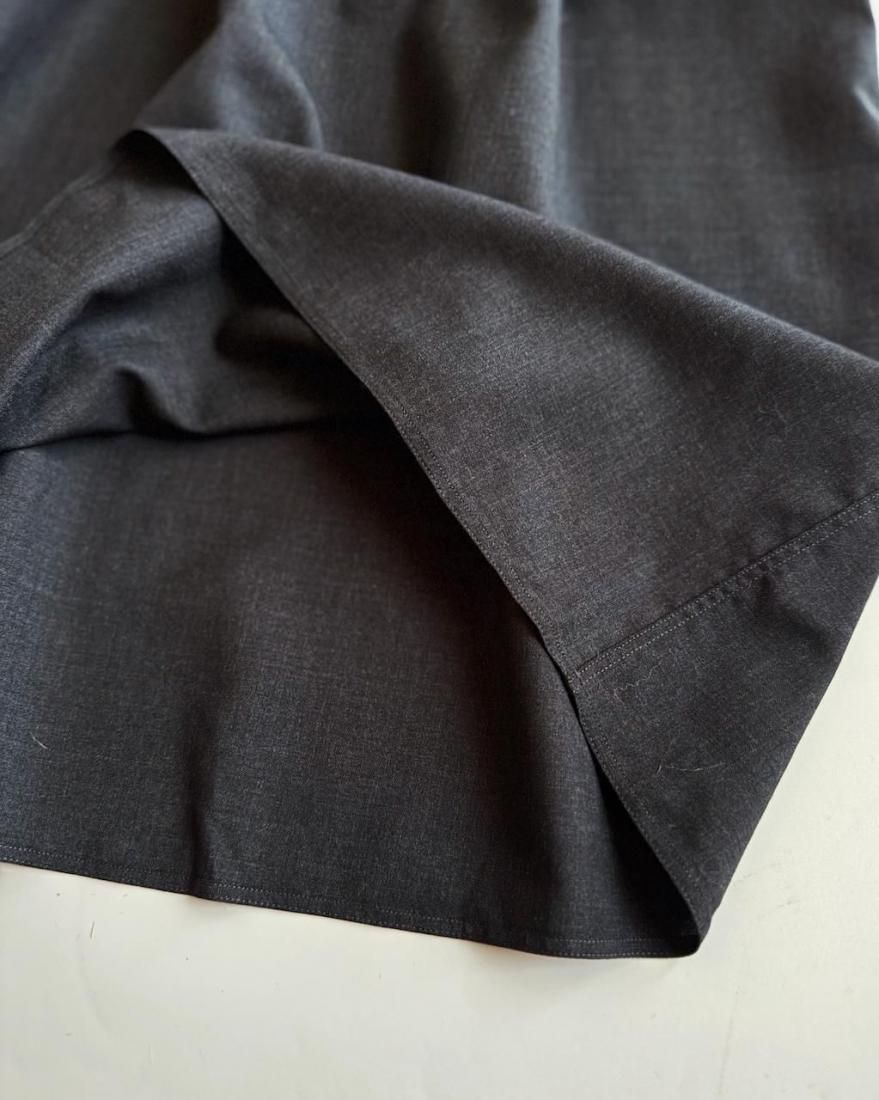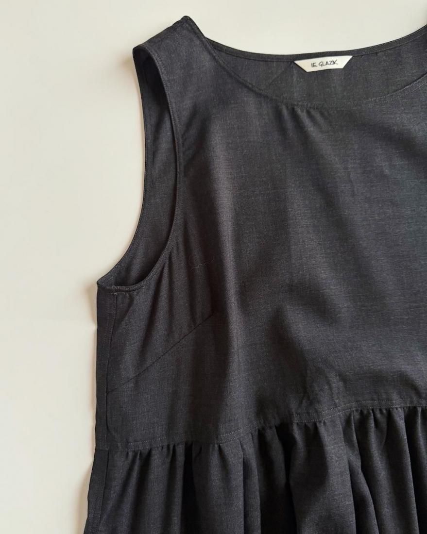 ウエストギャザーの女の子らしいシルエットながら、ダークグレイカラーでマニッシュな雰囲気も兼ね備えた、大人の女性に着て欲しい一枚。