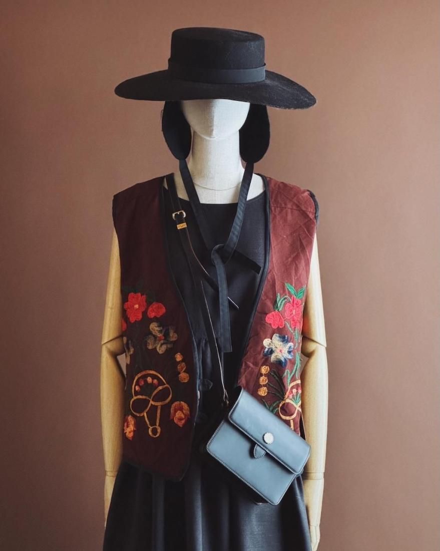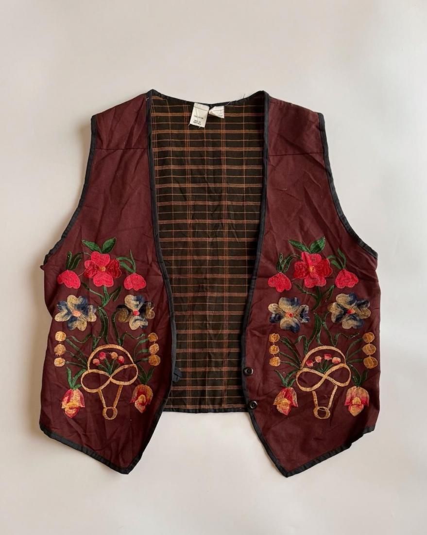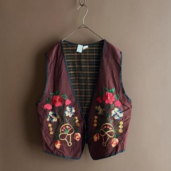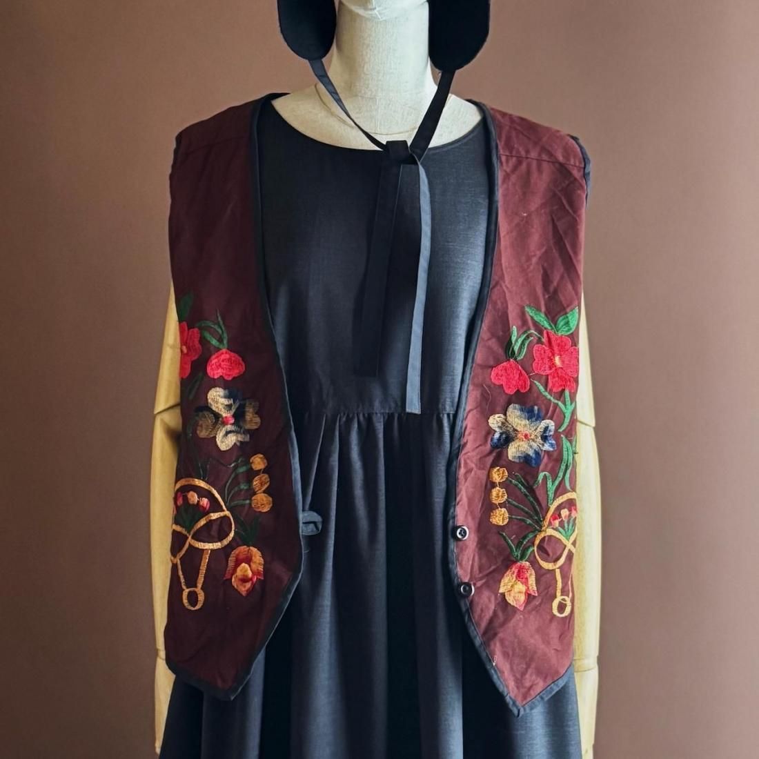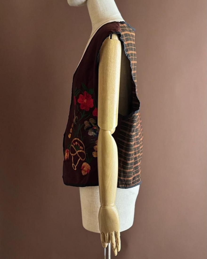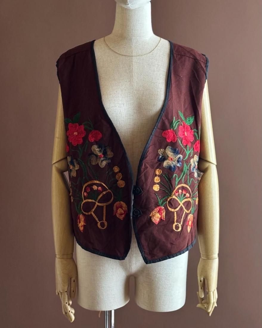シックなダークブラウンカラーベースにお花刺繍が施されたベスト。