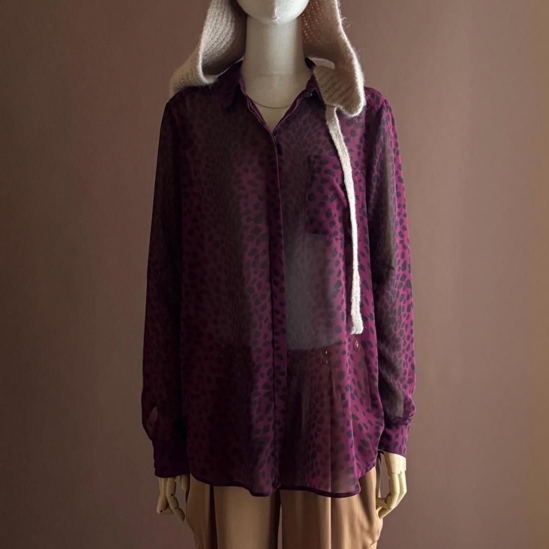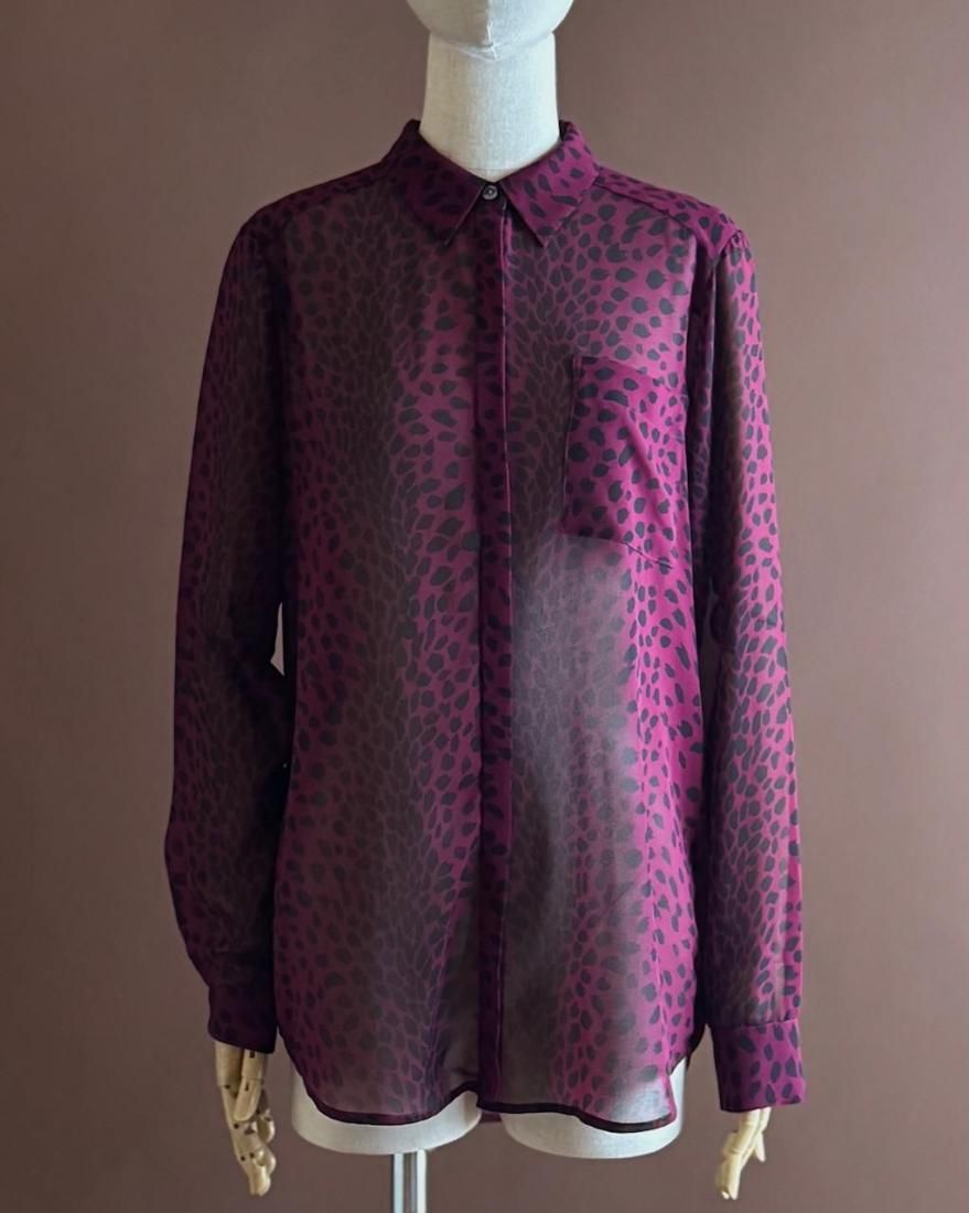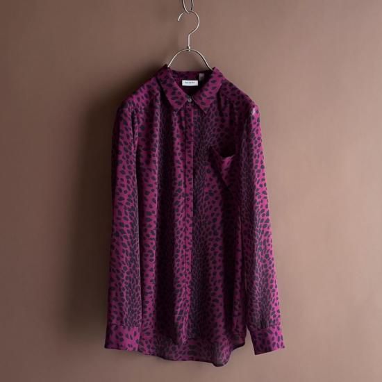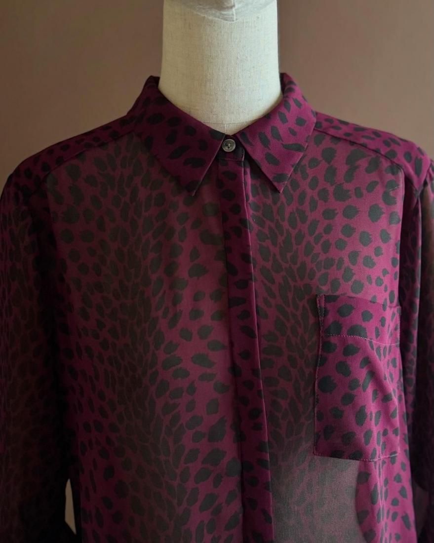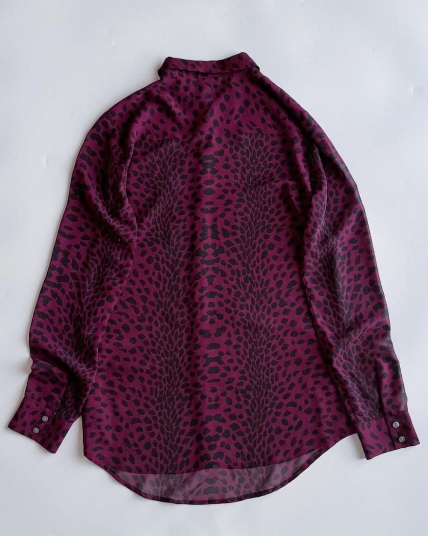 濃いプラムパープルカラーに黒のヒョウ柄、レオパードモチーフがシックで素敵なブラウス。