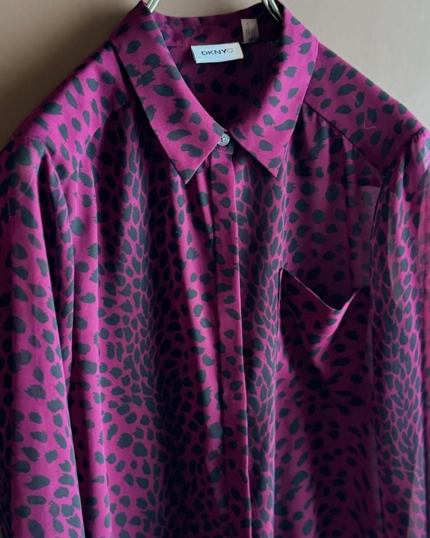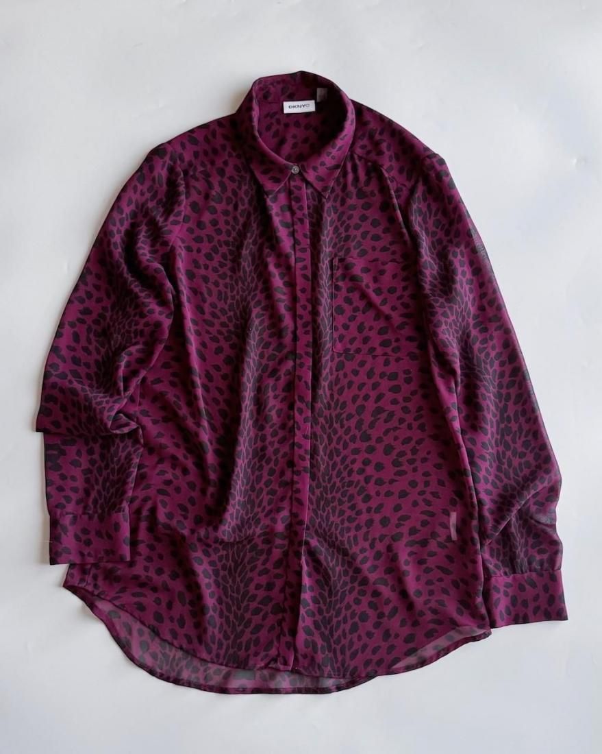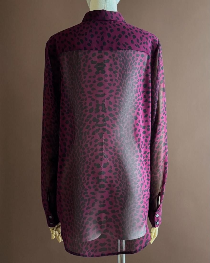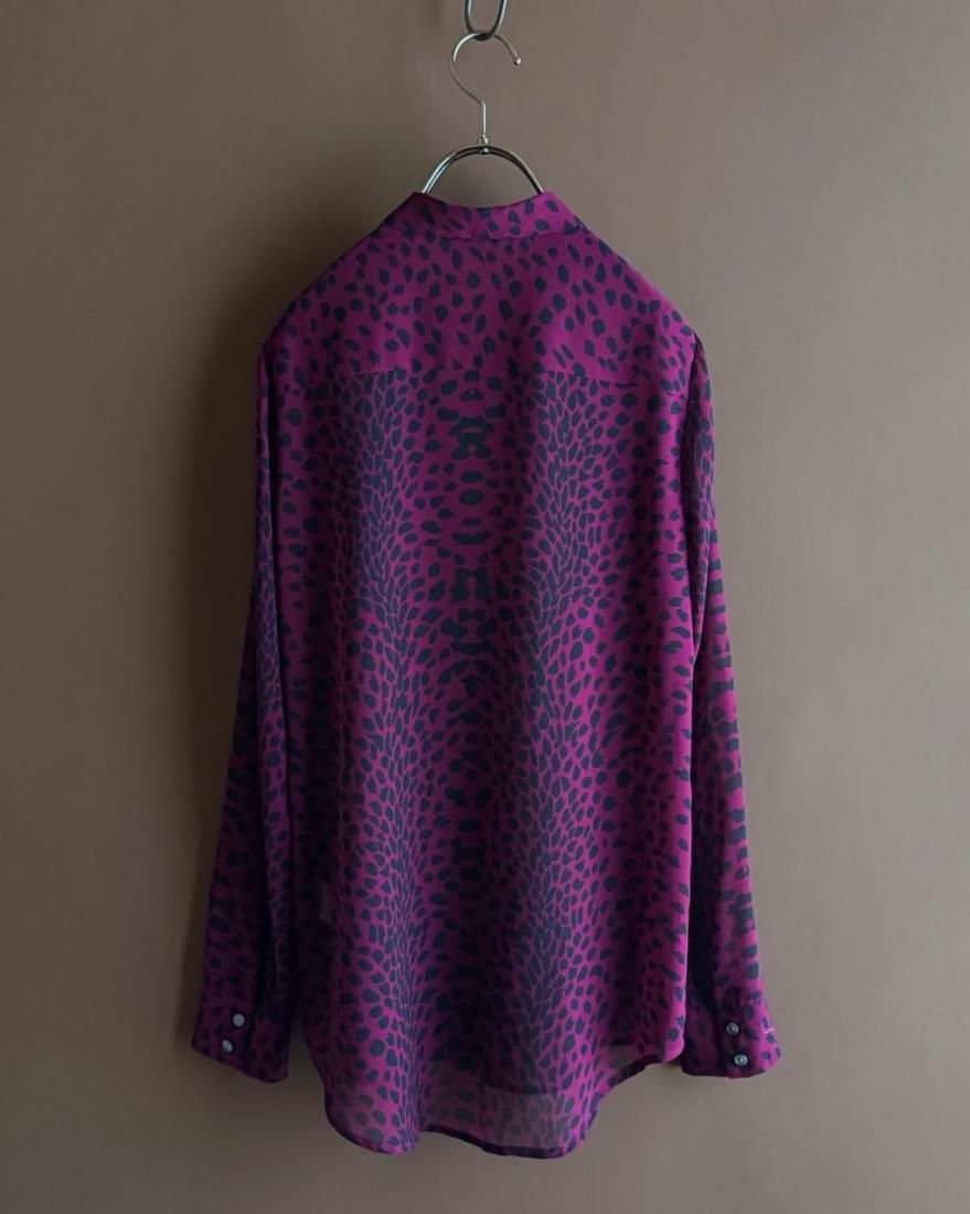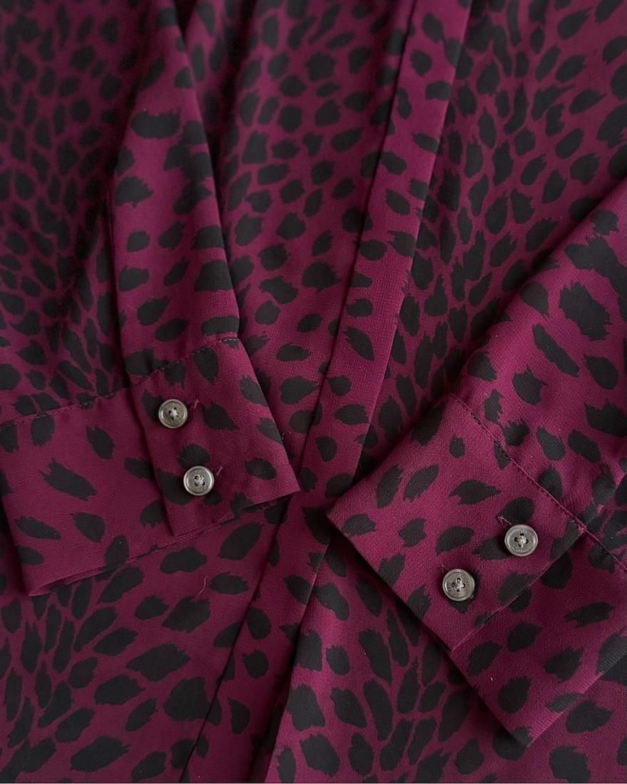 濃いプラムパープルカラーに黒のヒョウ柄、レオパードモチーフがシックで素敵なブラウス。