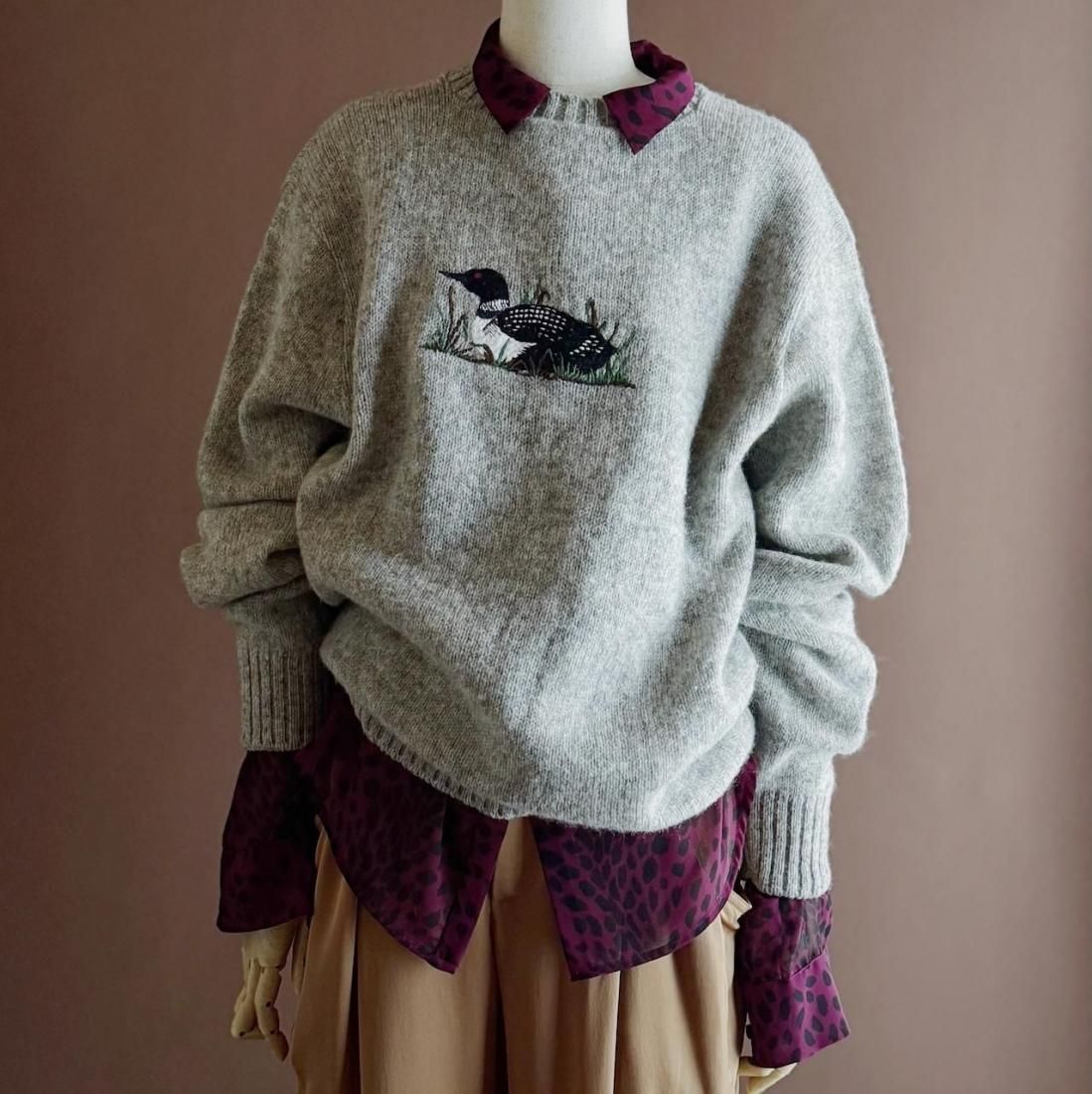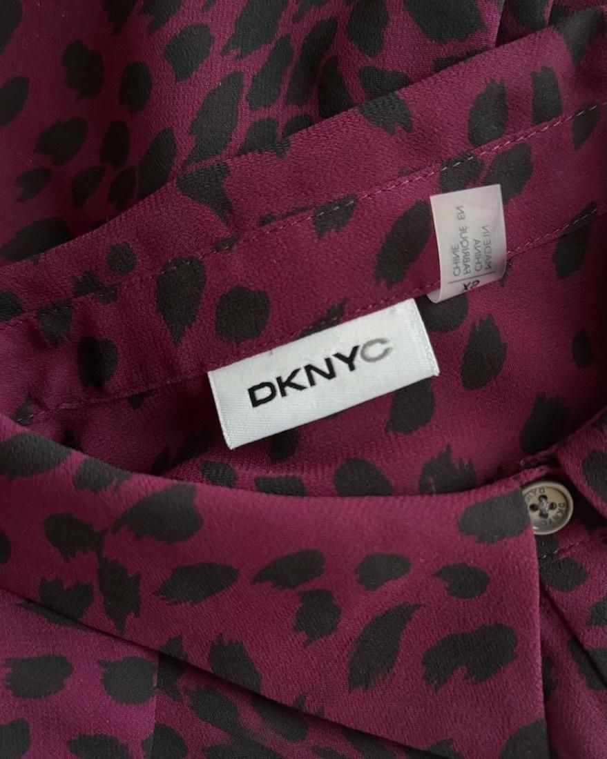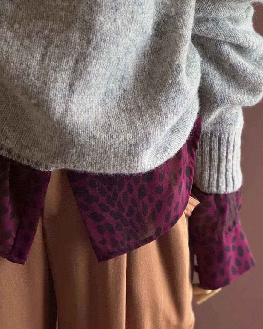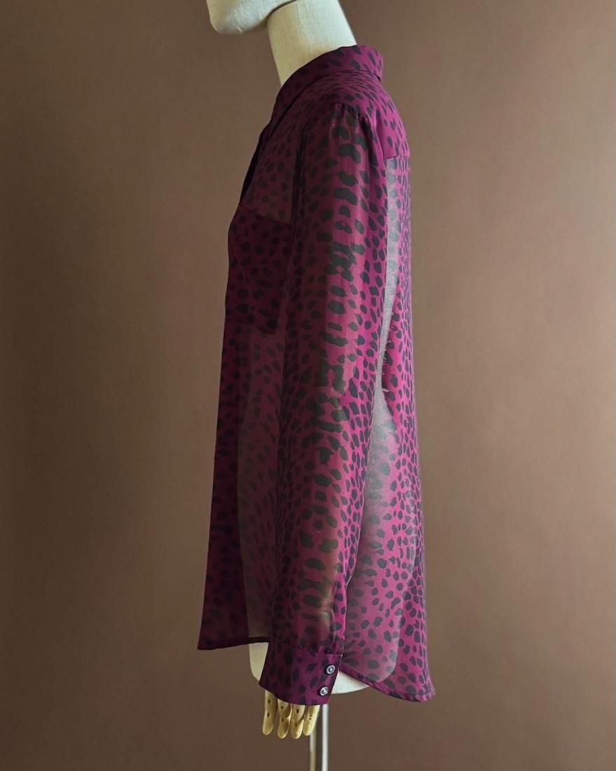 濃いプラムパープルカラーに黒のヒョウ柄、レオパードモチーフがシックで素敵なブラウス。