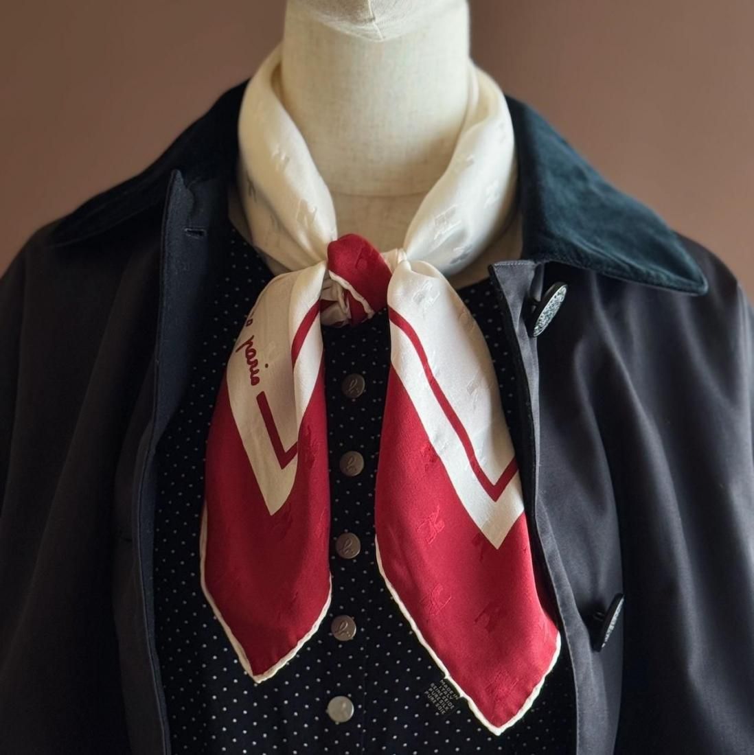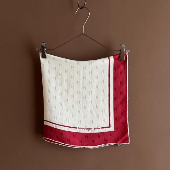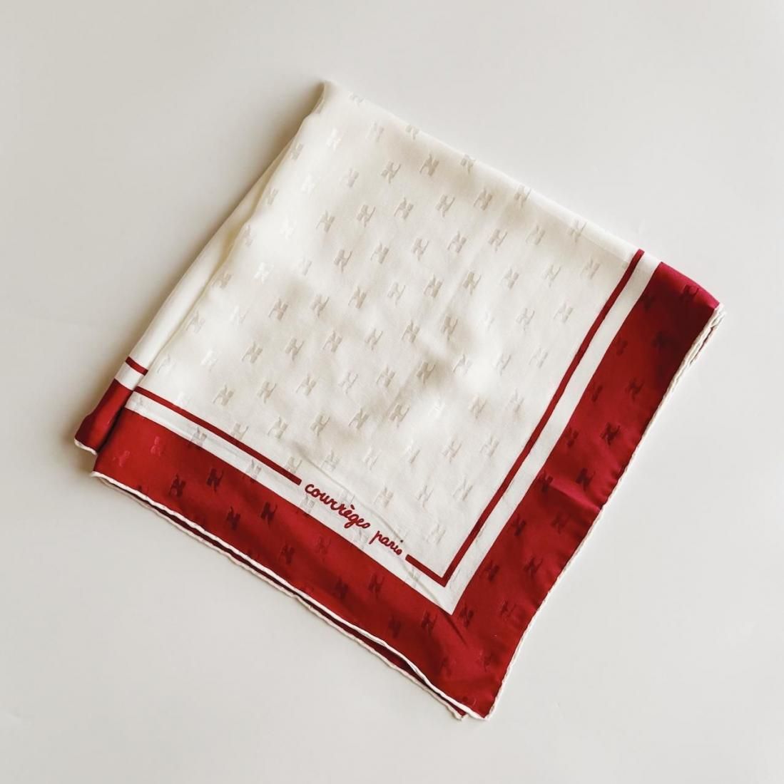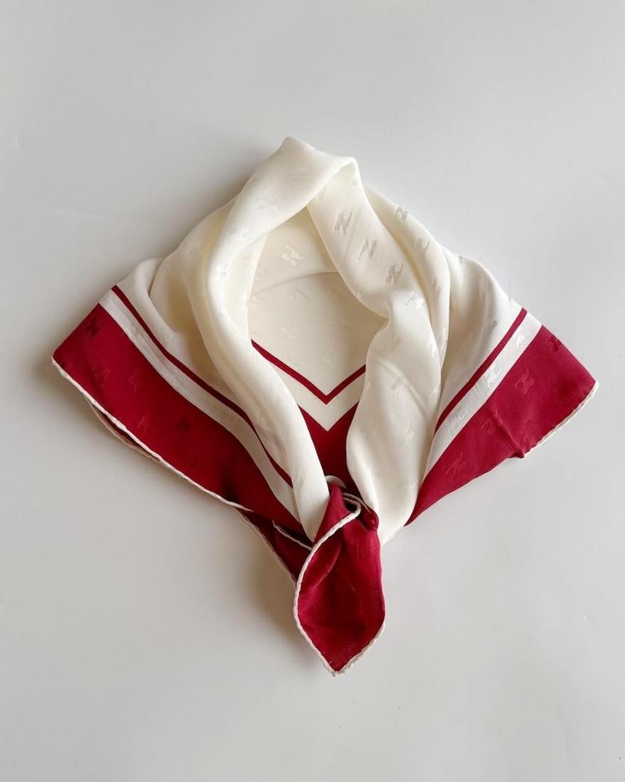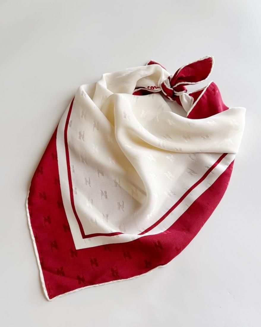 オフホワイト×ダークレッドの色合い、さりげない同色のロゴモノグラム使いが素敵なシルクスカーフ。