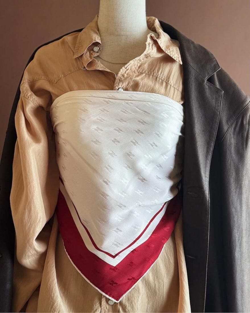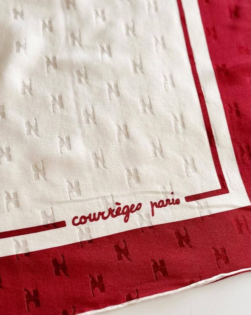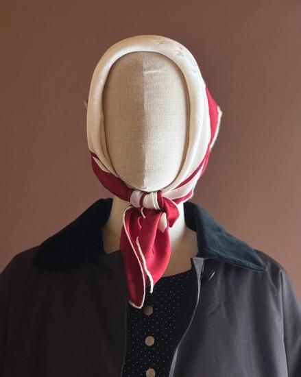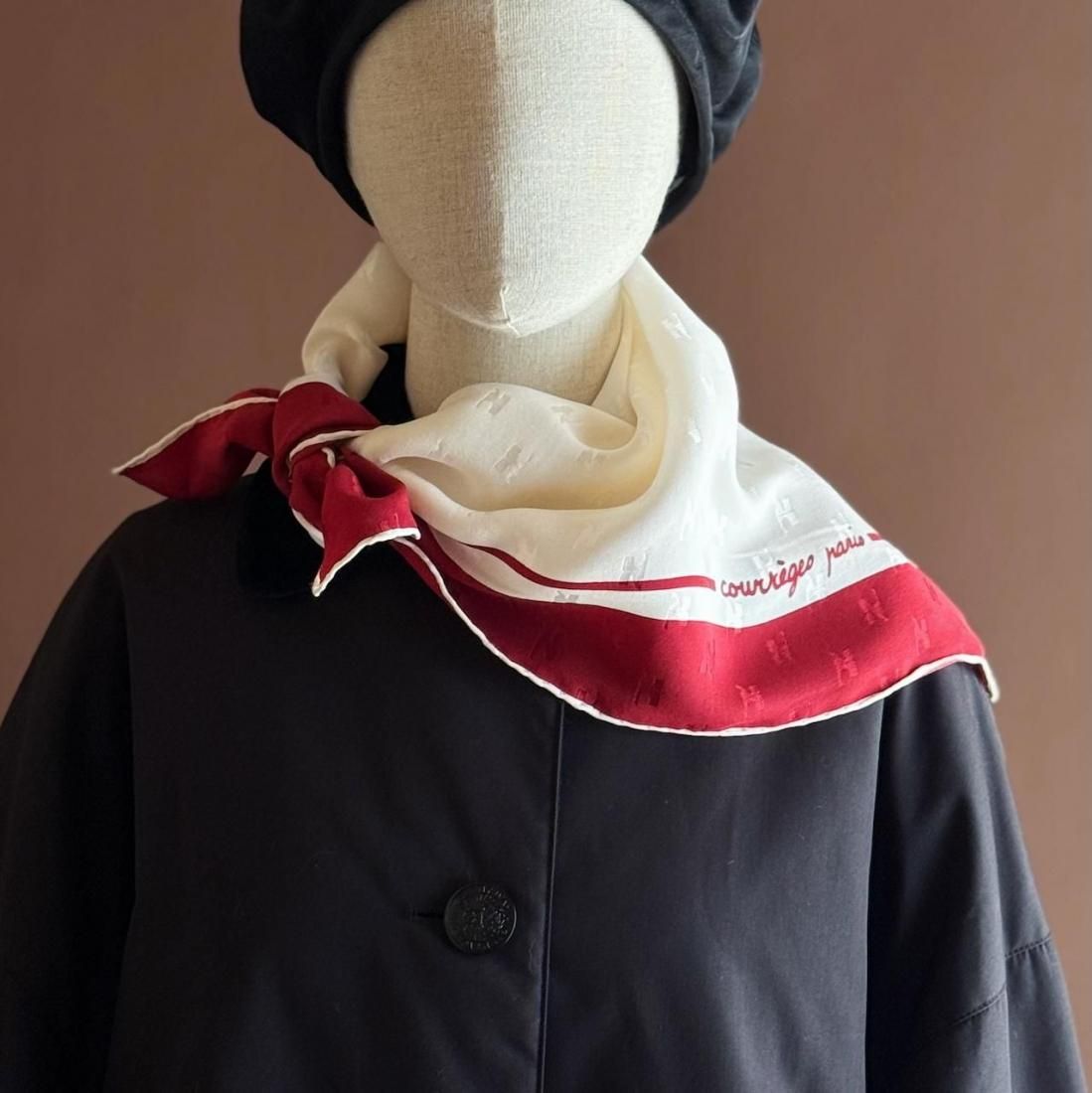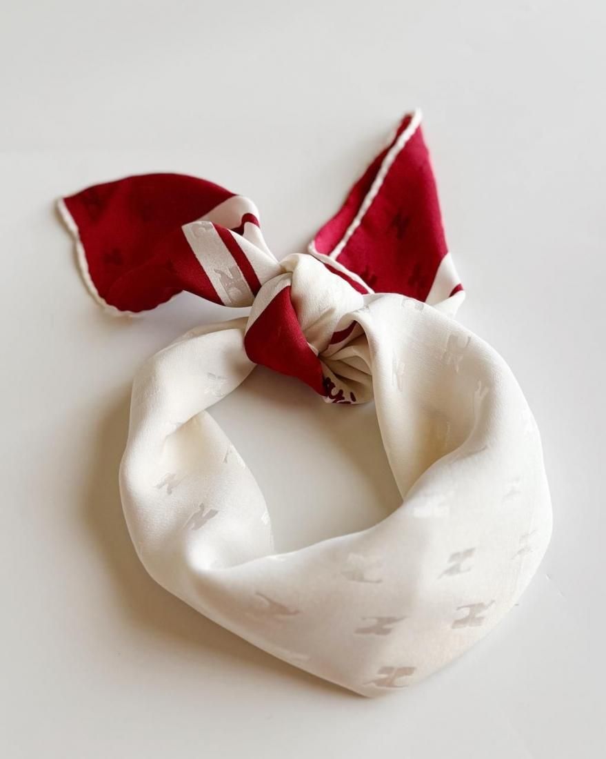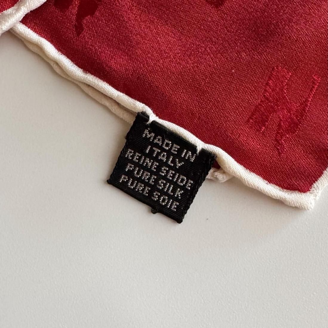 オフホワイト×ダークレッドの色合い、さりげない同色のロゴモノグラム使いが素敵なシルクスカーフ。
