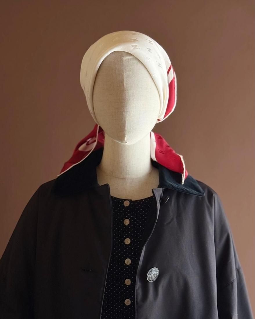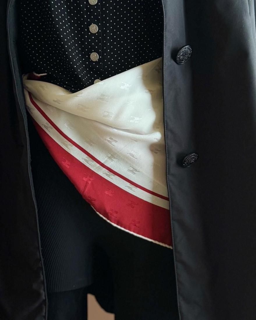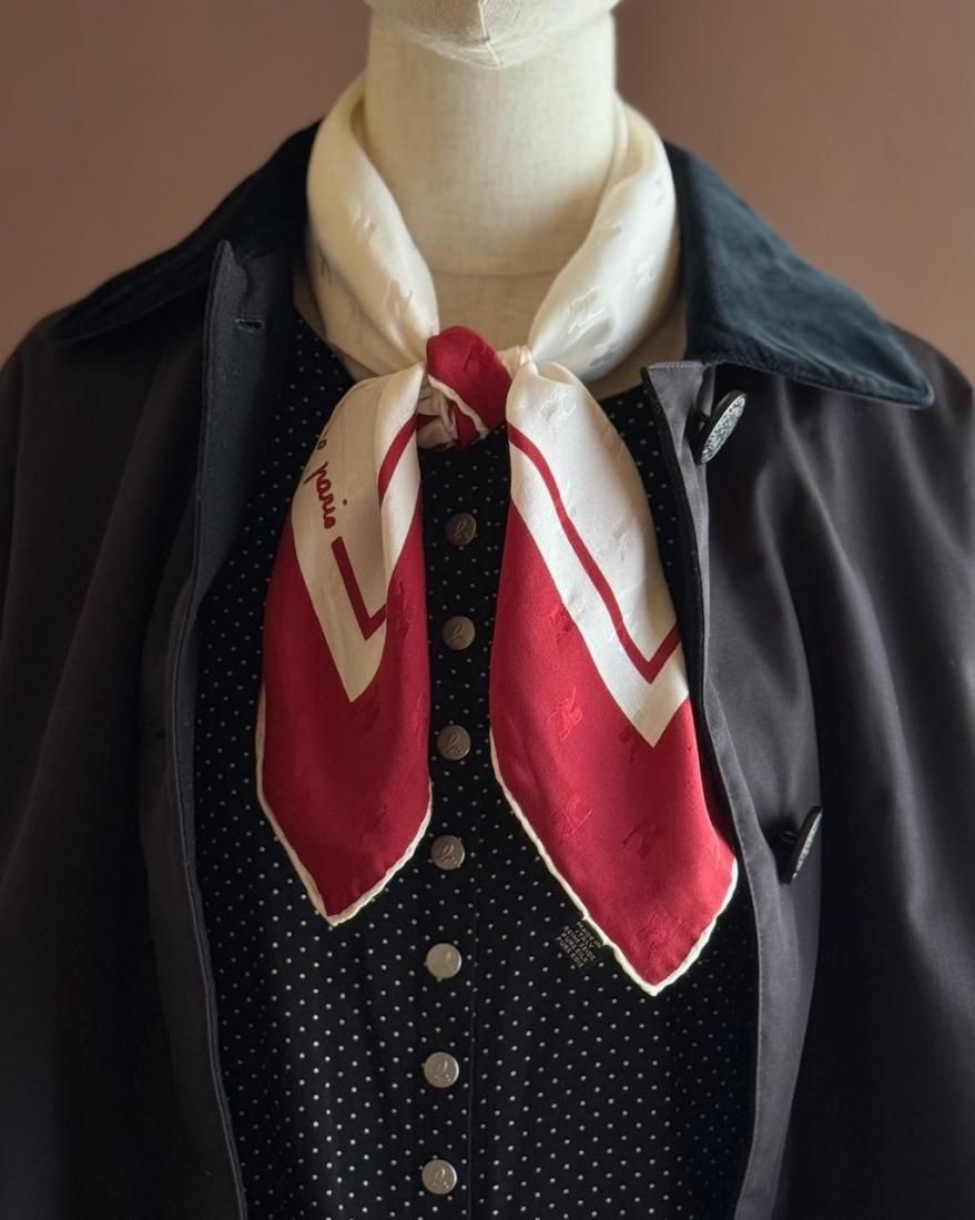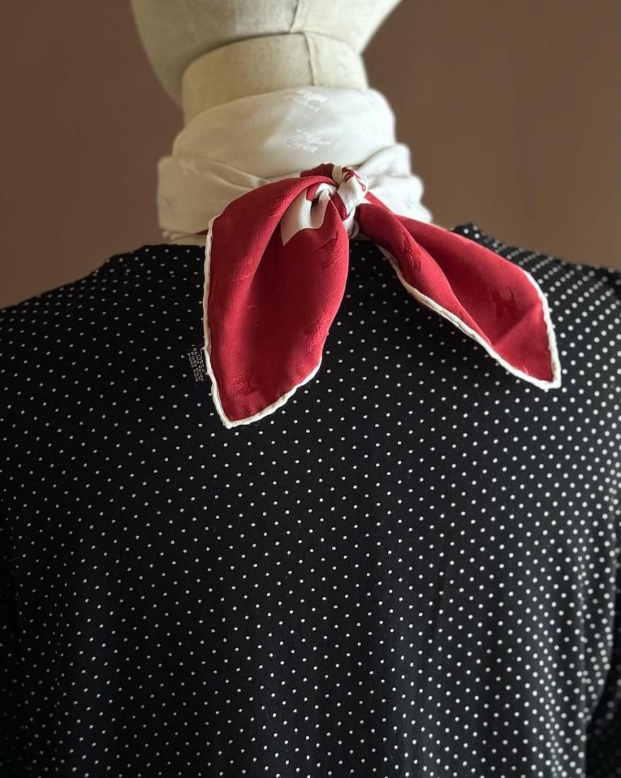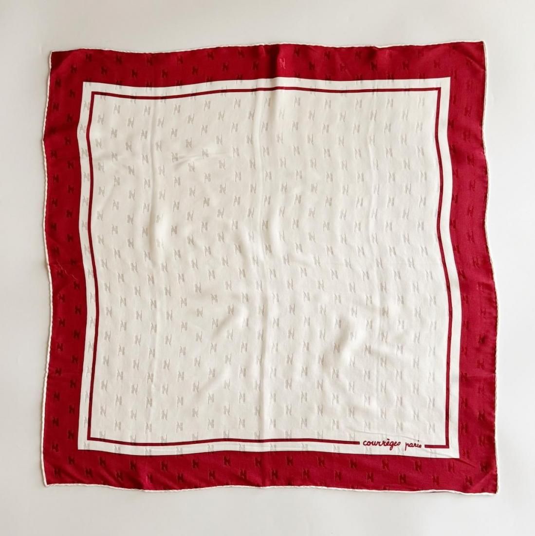 オフホワイト×ダークレッドの色合い、さりげない同色のロゴモノグラム使いが素敵なシルクスカーフ。