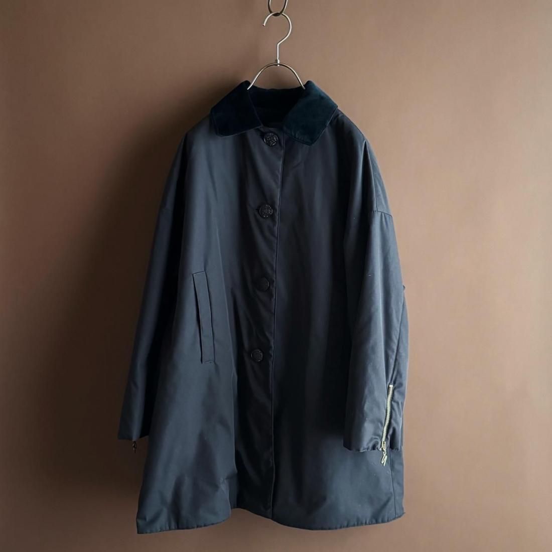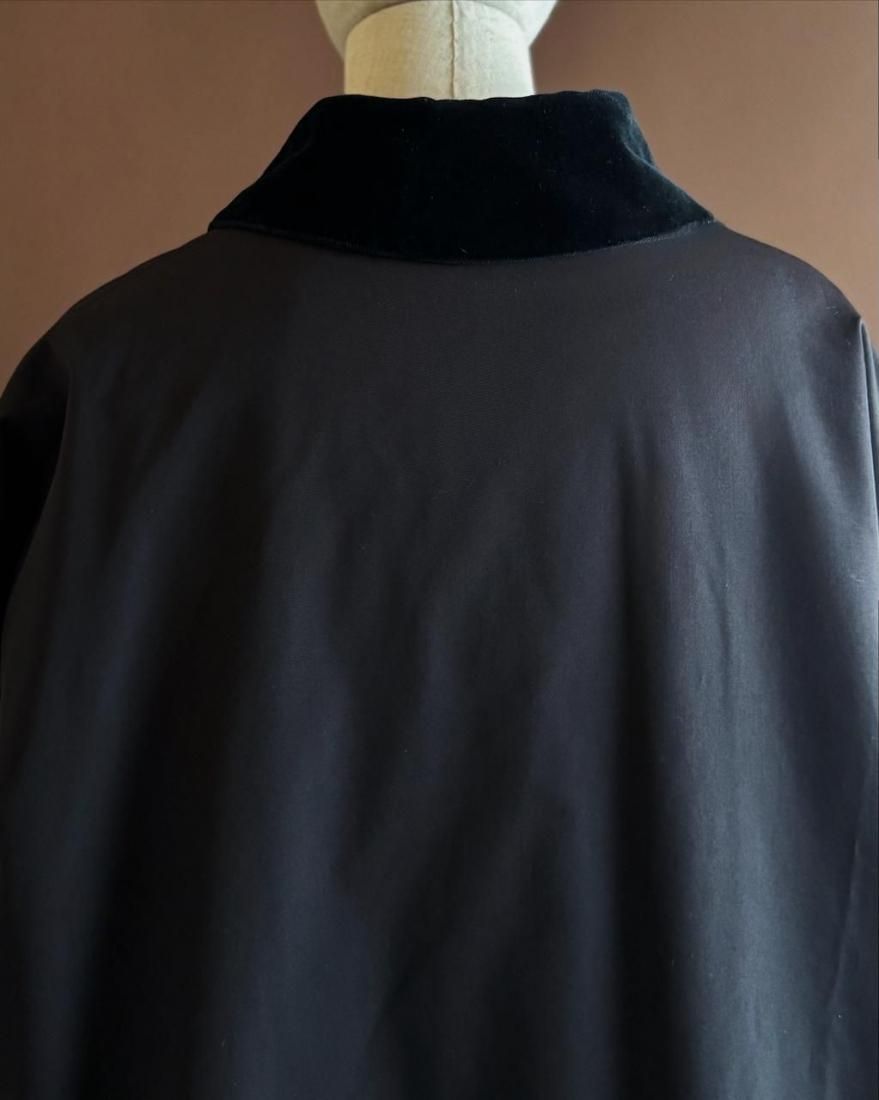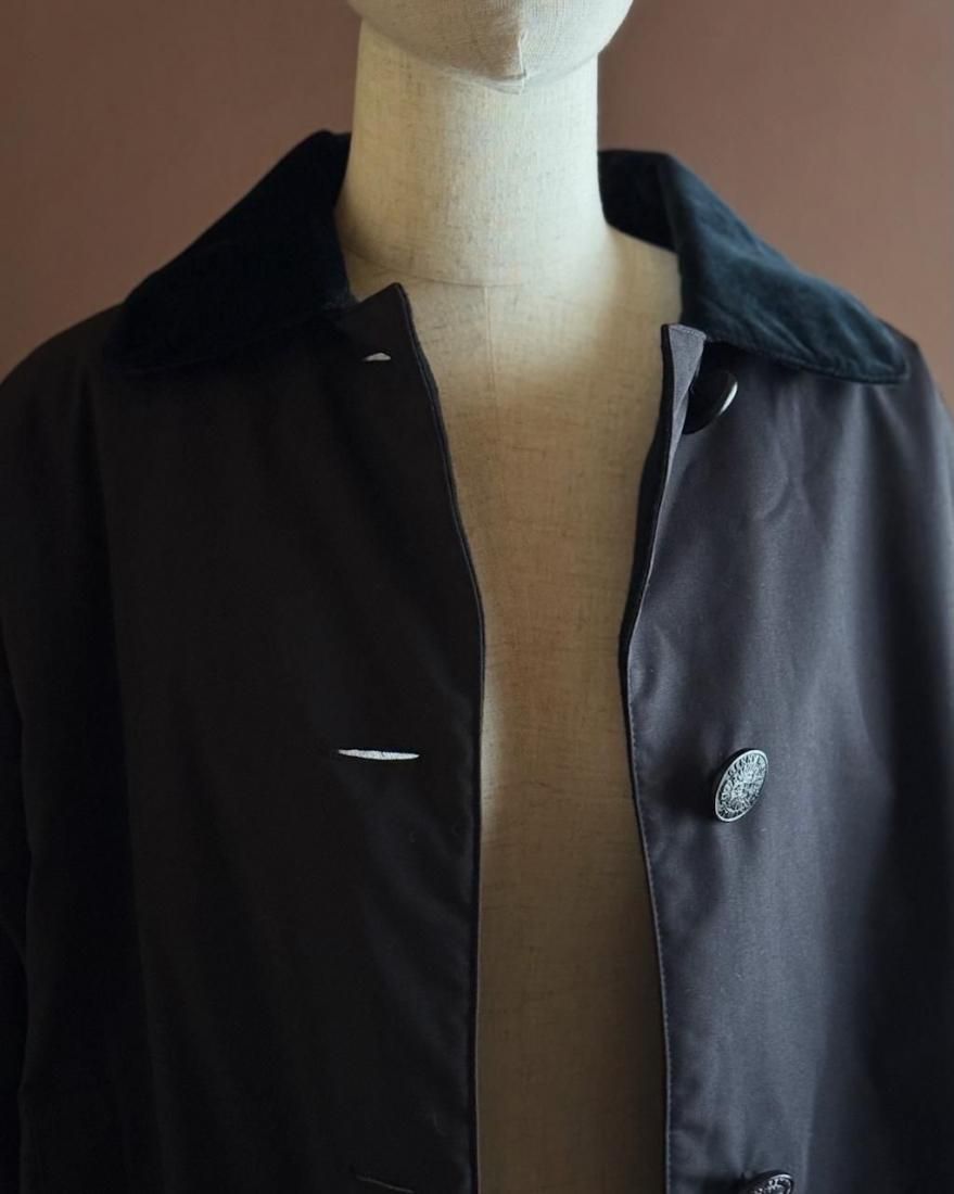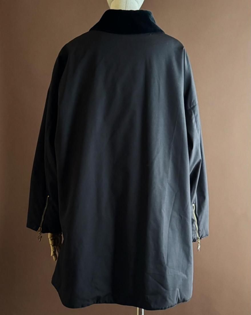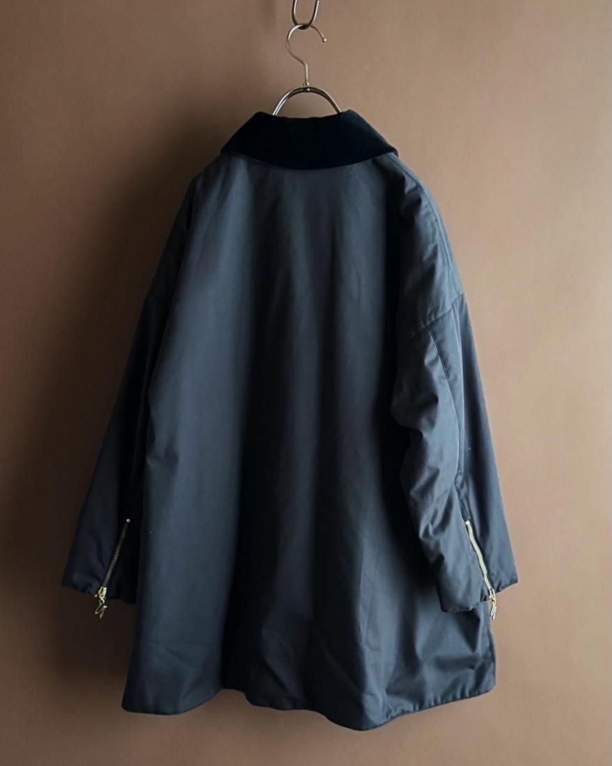 ベロア素材の襟、見頃中綿裏地はウール混フリースで暖かなハンティングジャケット、カバーオールジャケット。