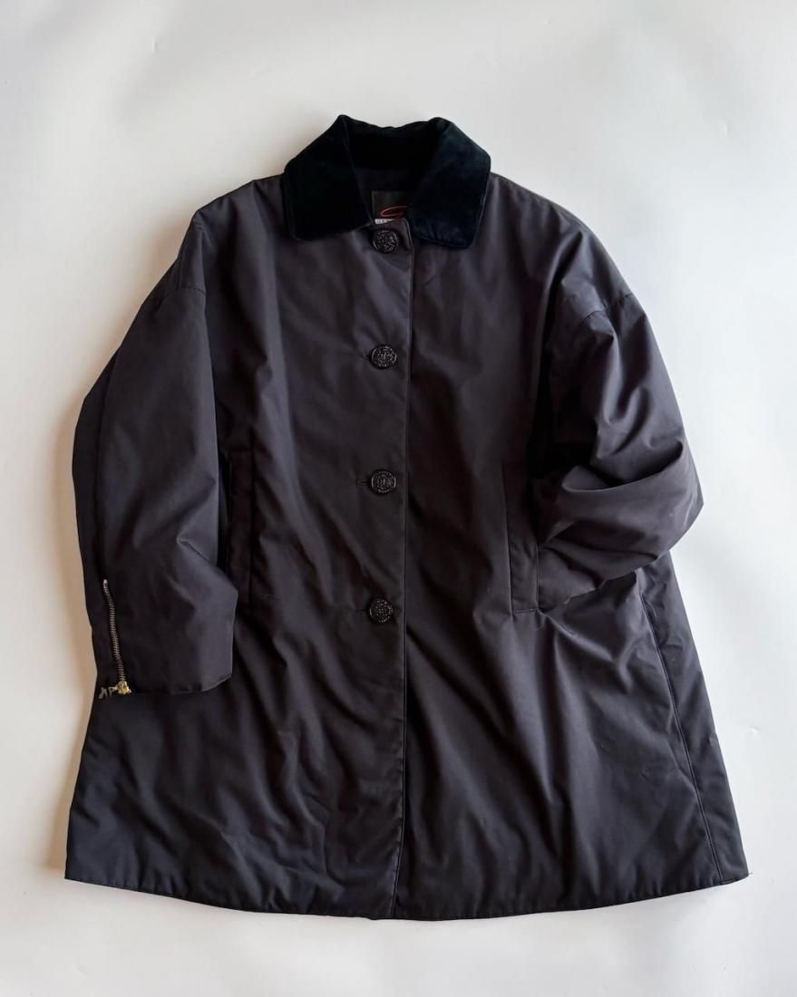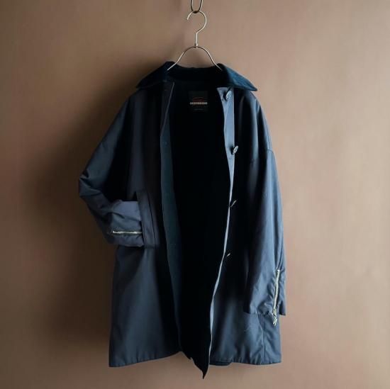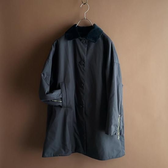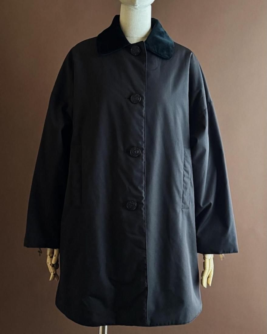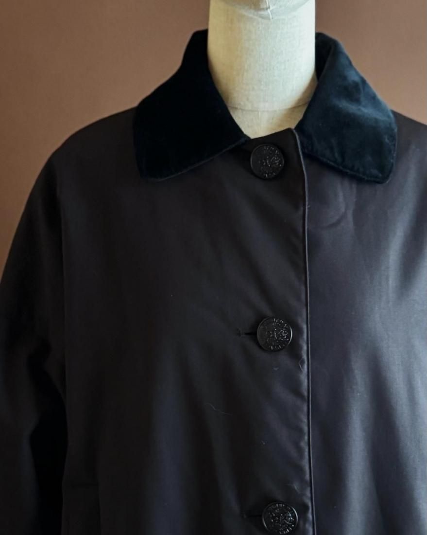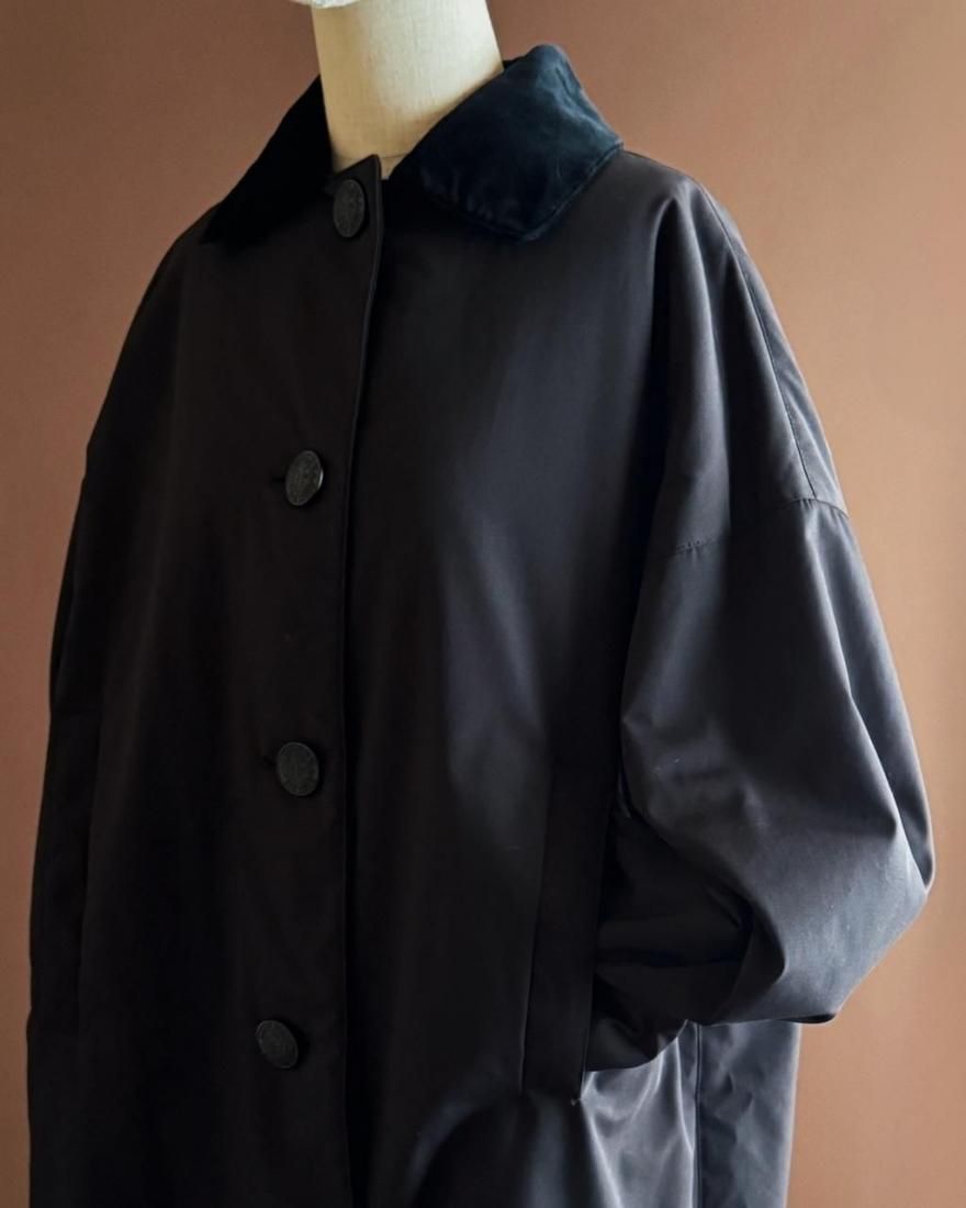 ベロア素材の襟、見頃中綿裏地はウール混フリースで暖かなハンティングジャケット、カバーオールジャケット。