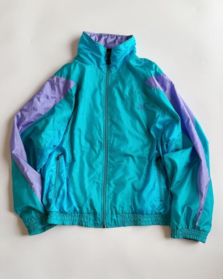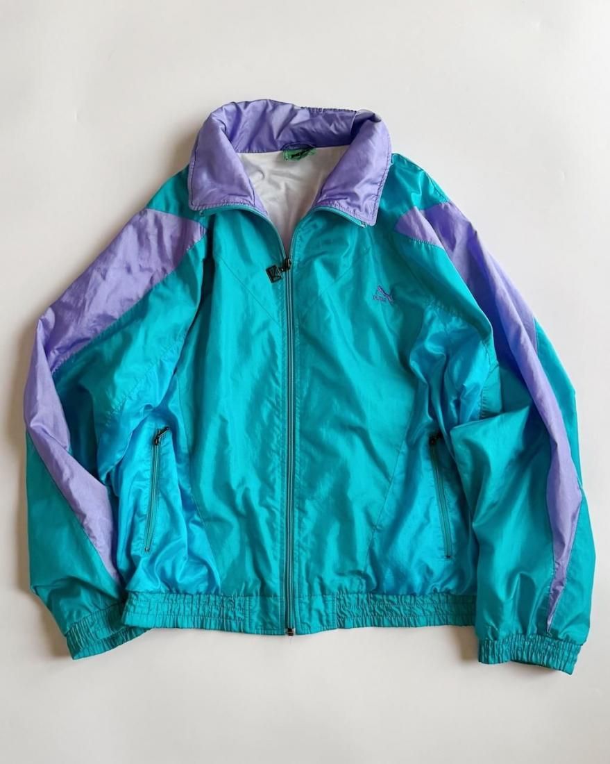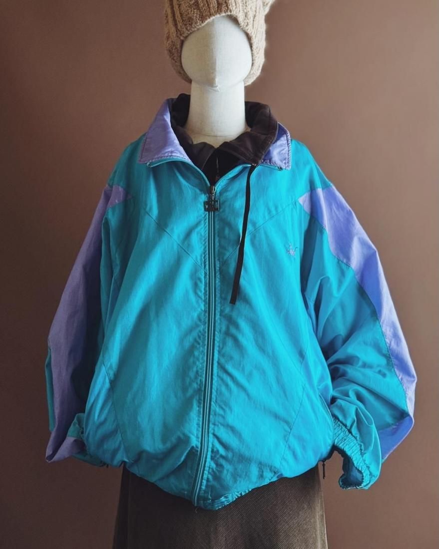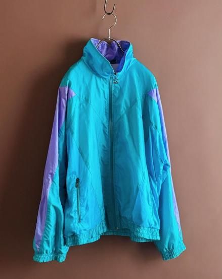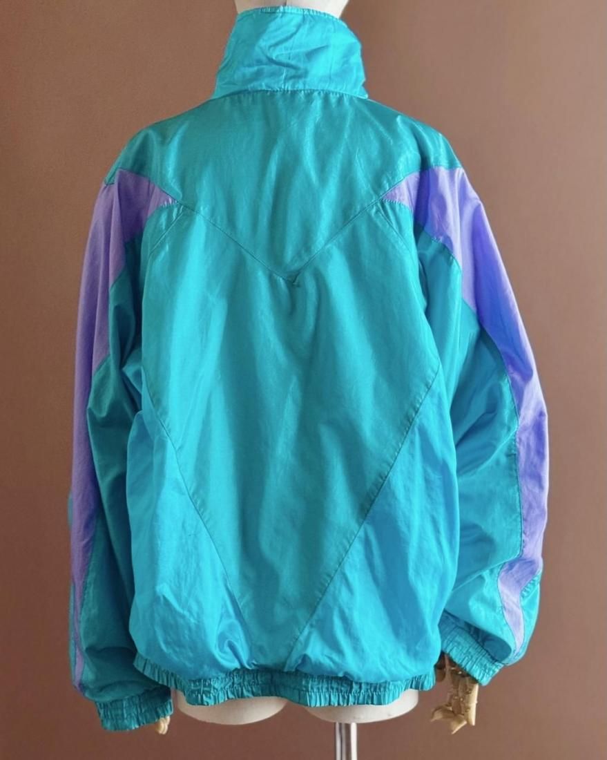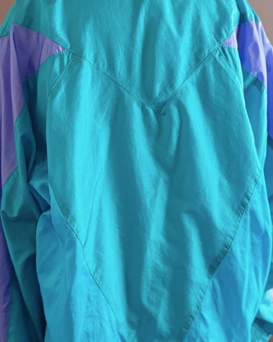 ピーコックブルー×ターコイズブルー×ラベンダーパープルの配色が素敵なナイロンブルゾン、ウィンドブレーカージャケット。