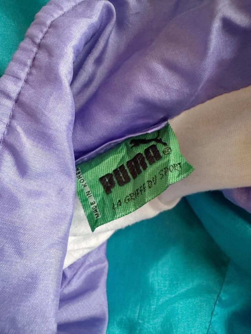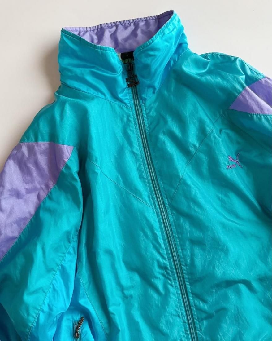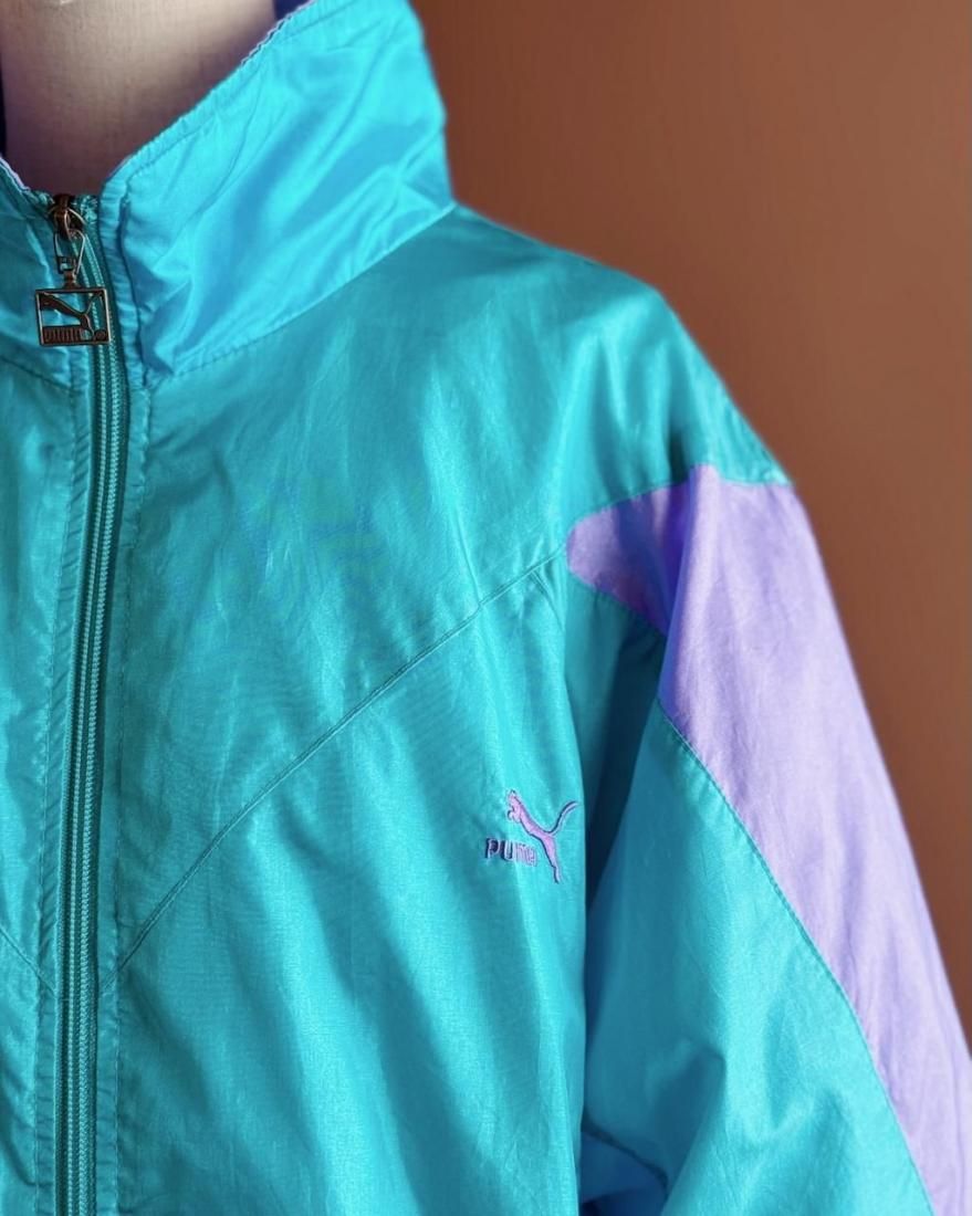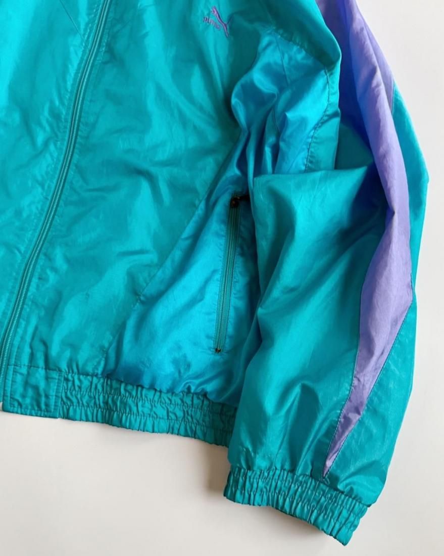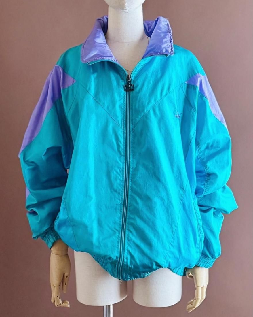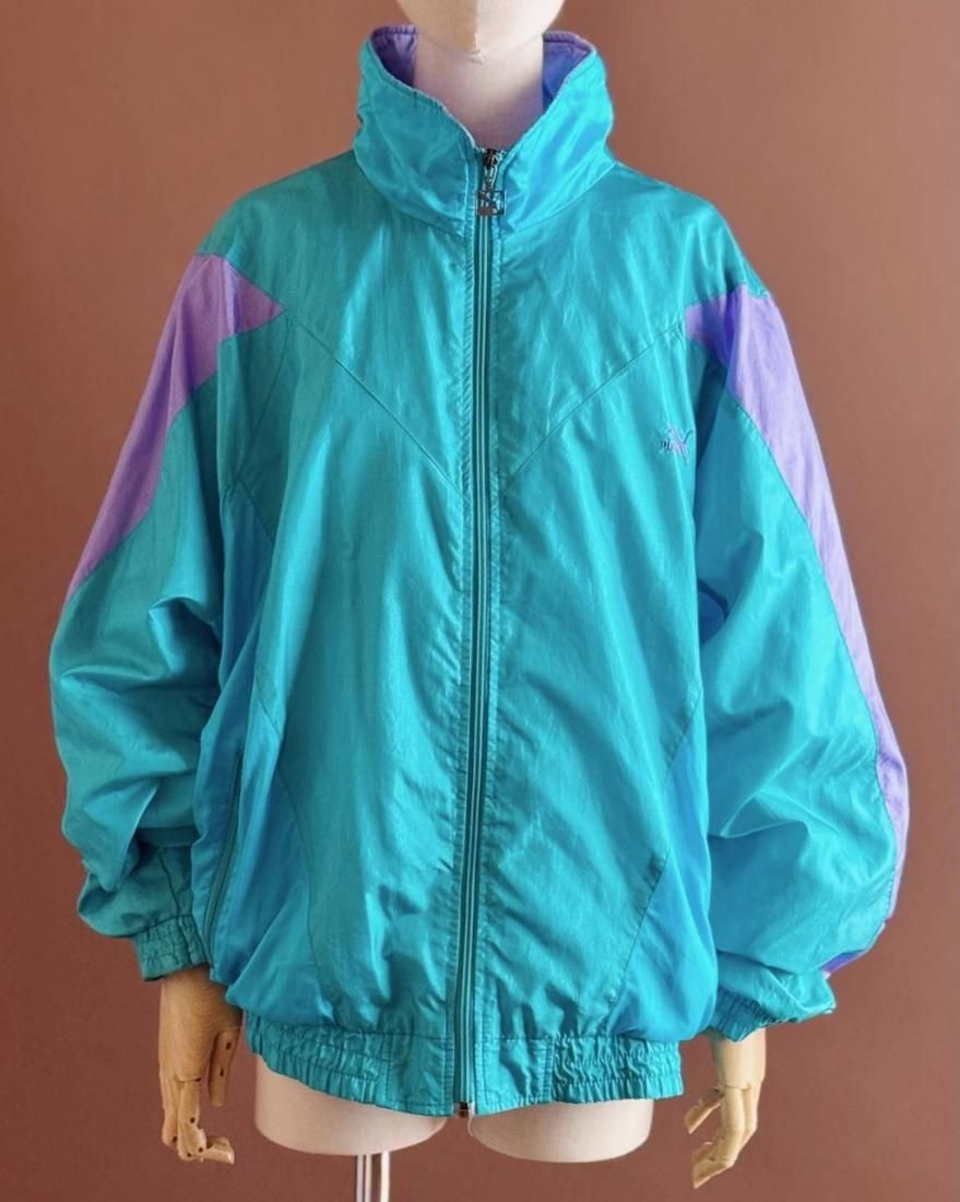 ピーコックブルー×ターコイズブルー×ラベンダーパープルの配色が素敵なナイロンブルゾン、ウィンドブレーカージャケット。