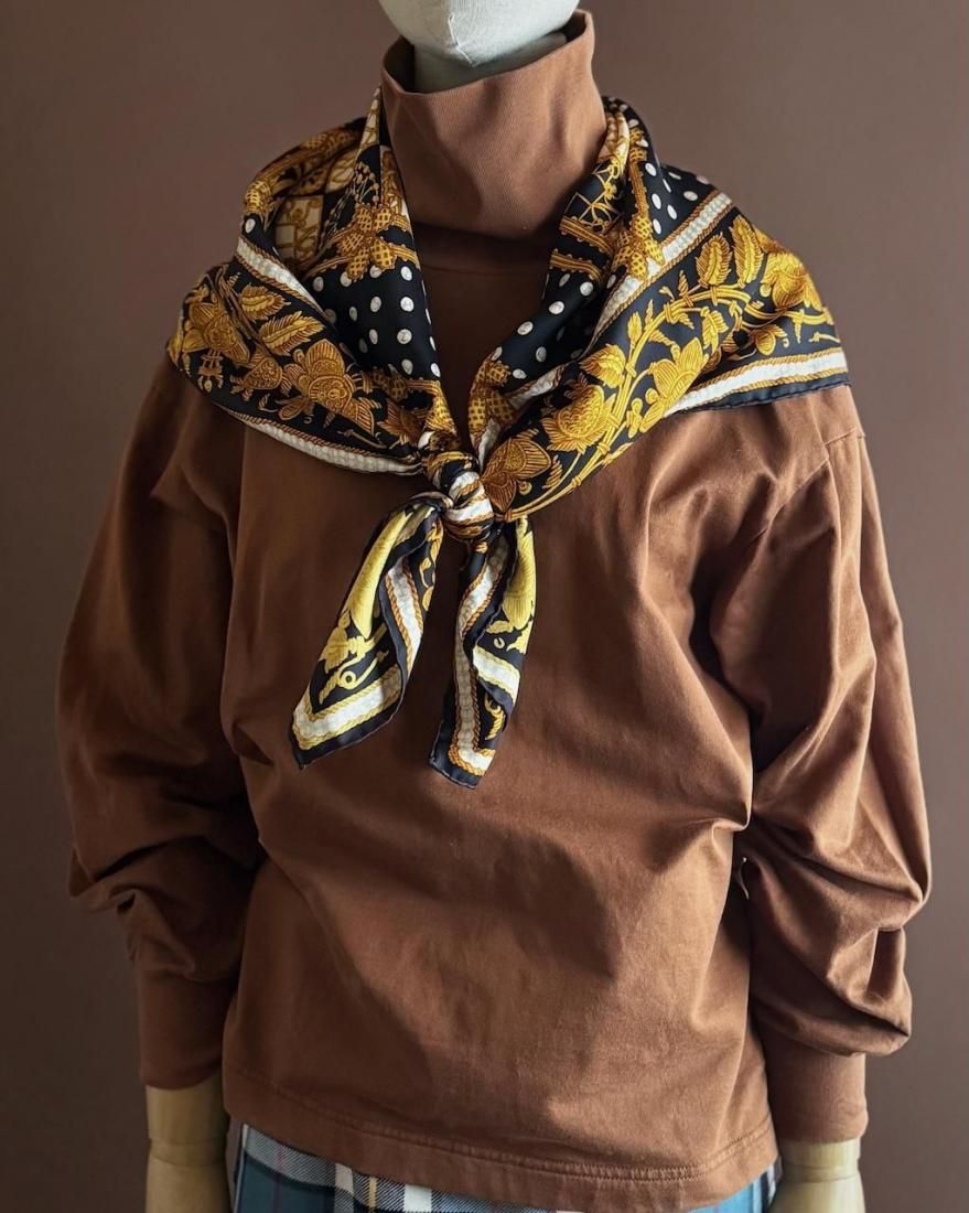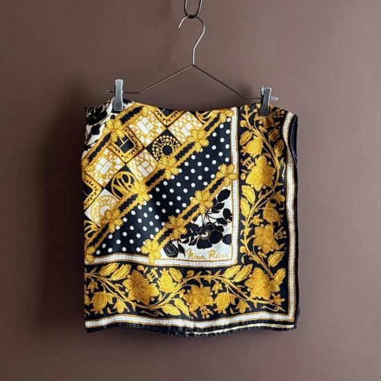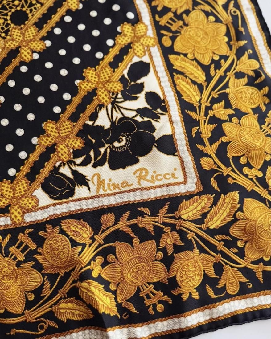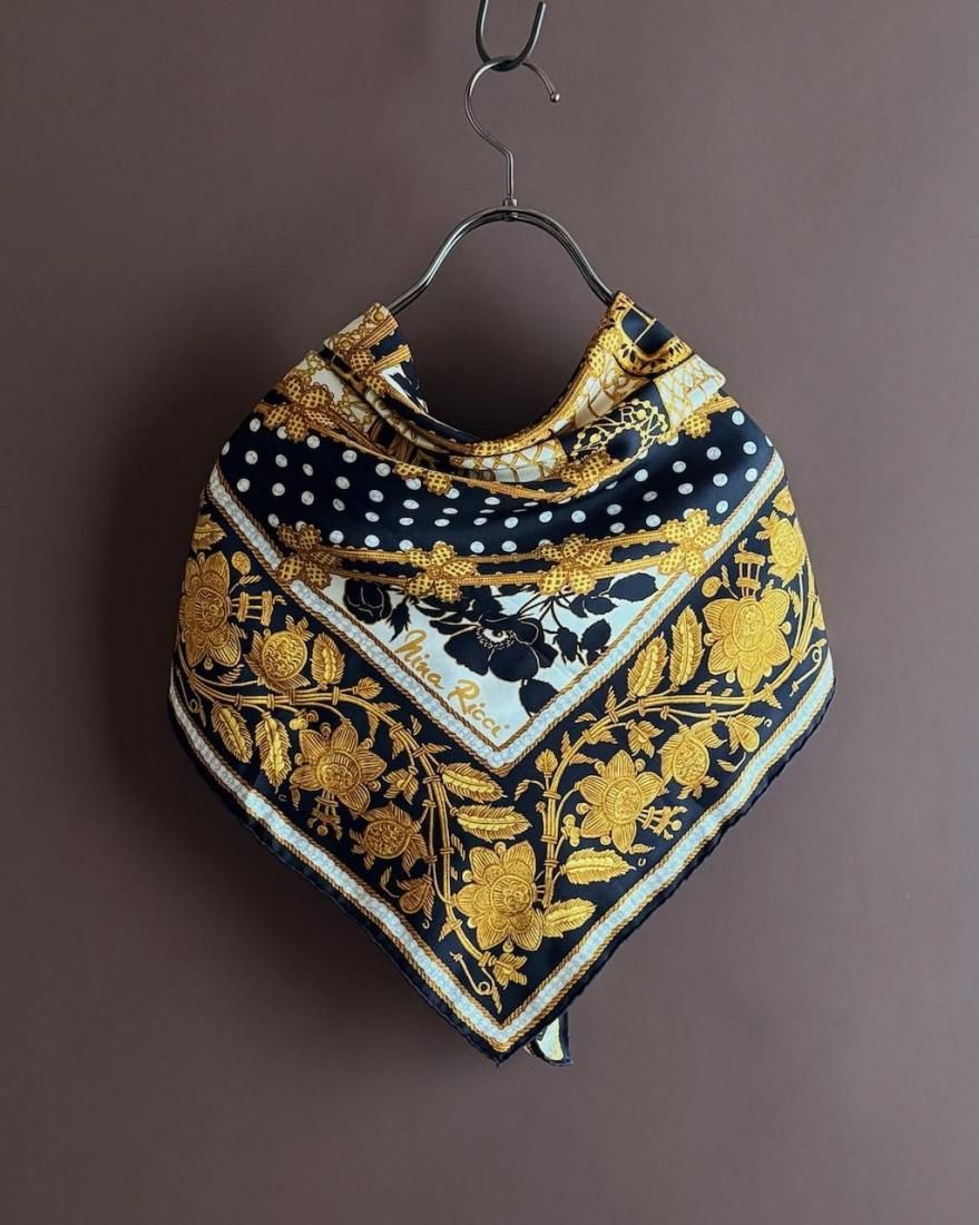 ブラックカラーベースにゴールド、オフホワイト、ライトグレーでお花模様やドット、チェーンのようなモチーフが描かれた、クラシカルなシルクスカーフ。