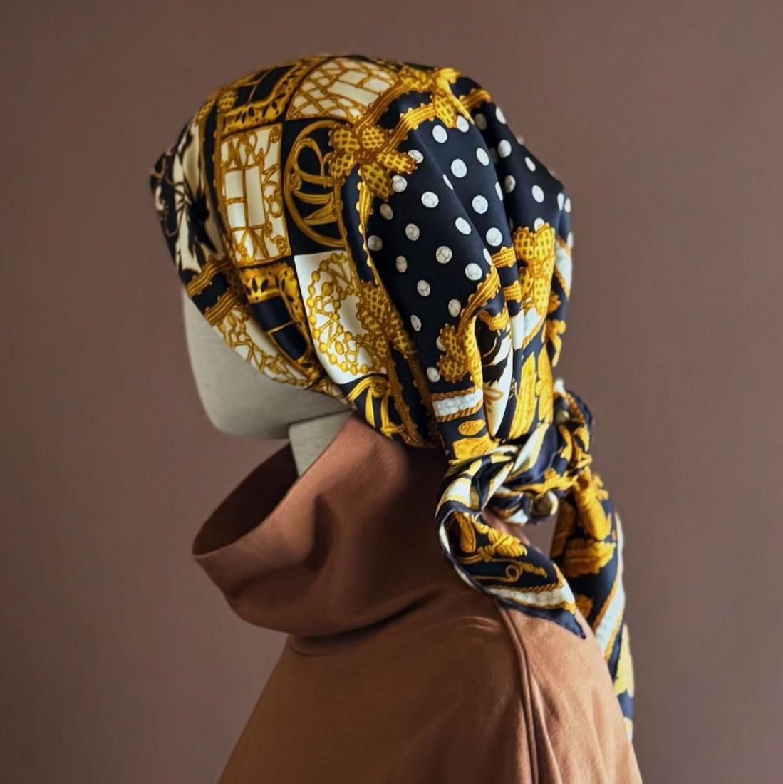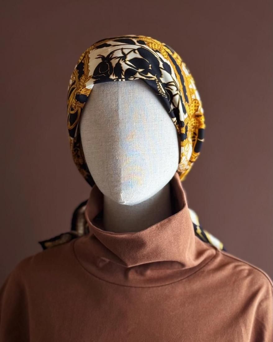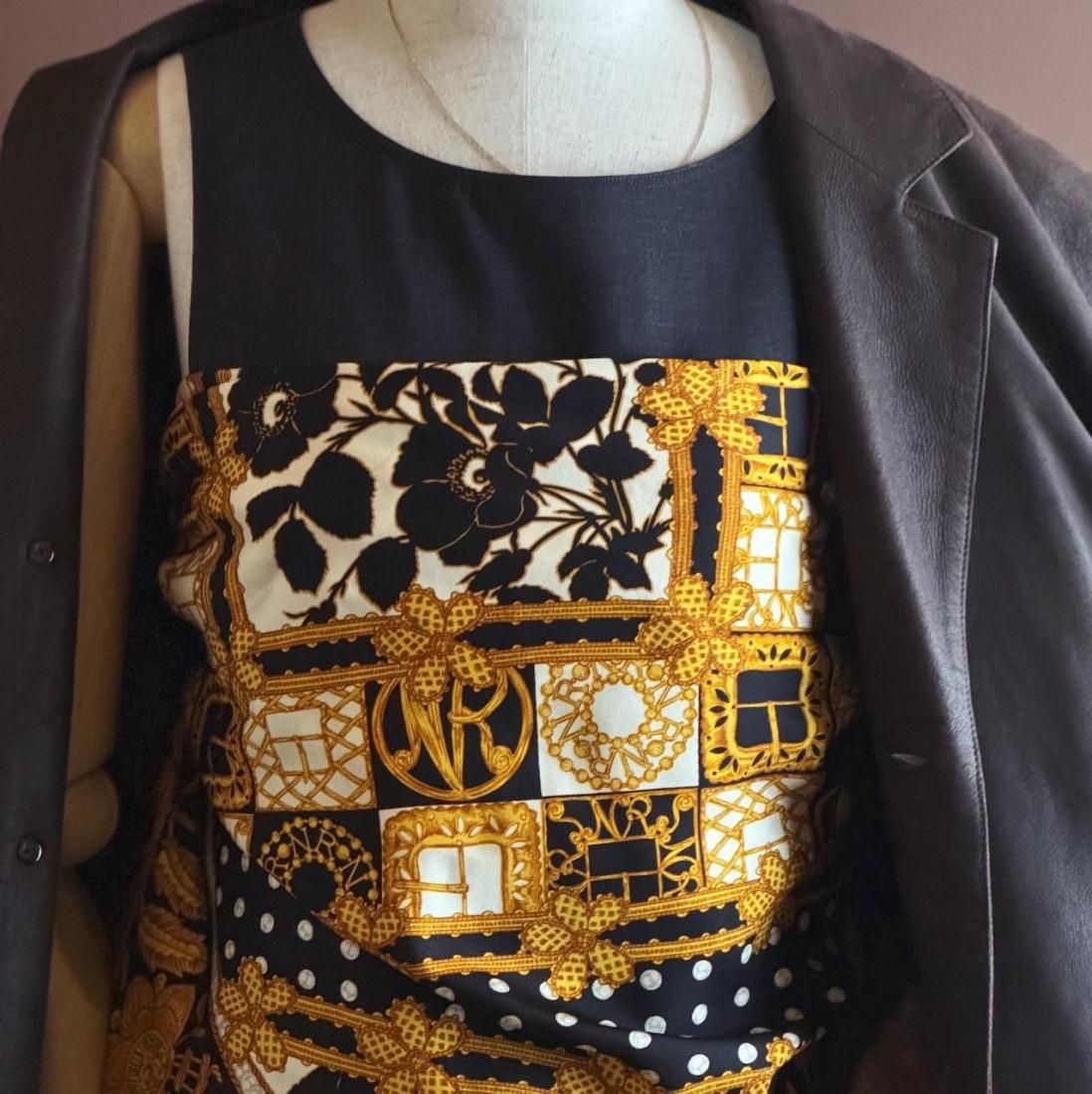 ブラックカラーベースにゴールド、オフホワイト、ライトグレーでお花模様やドット、チェーンのようなモチーフが描かれた、クラシカルなシルクスカーフ。