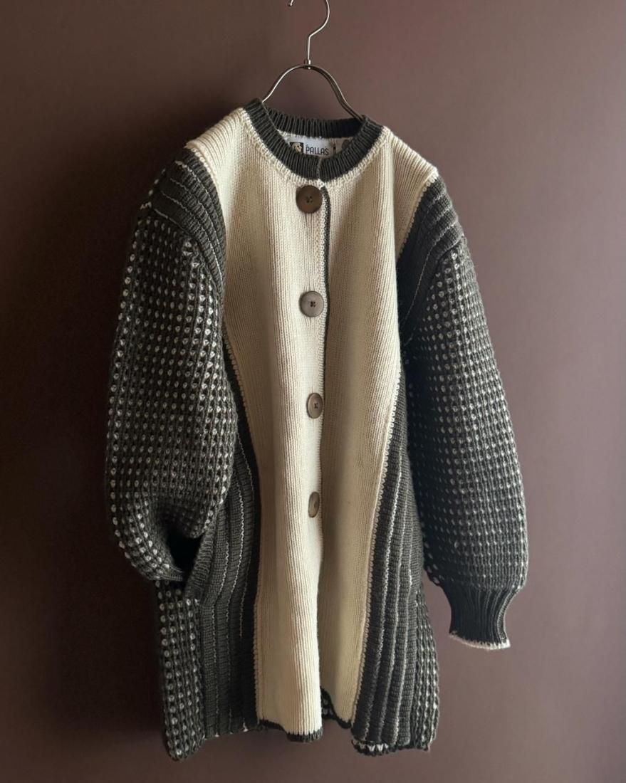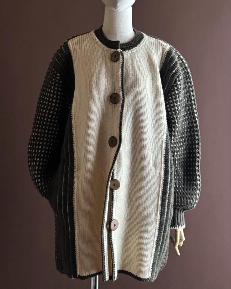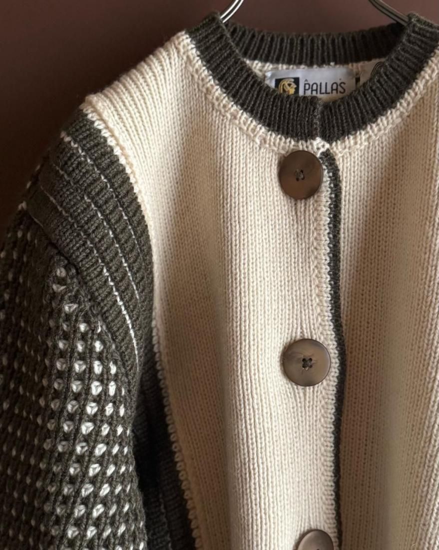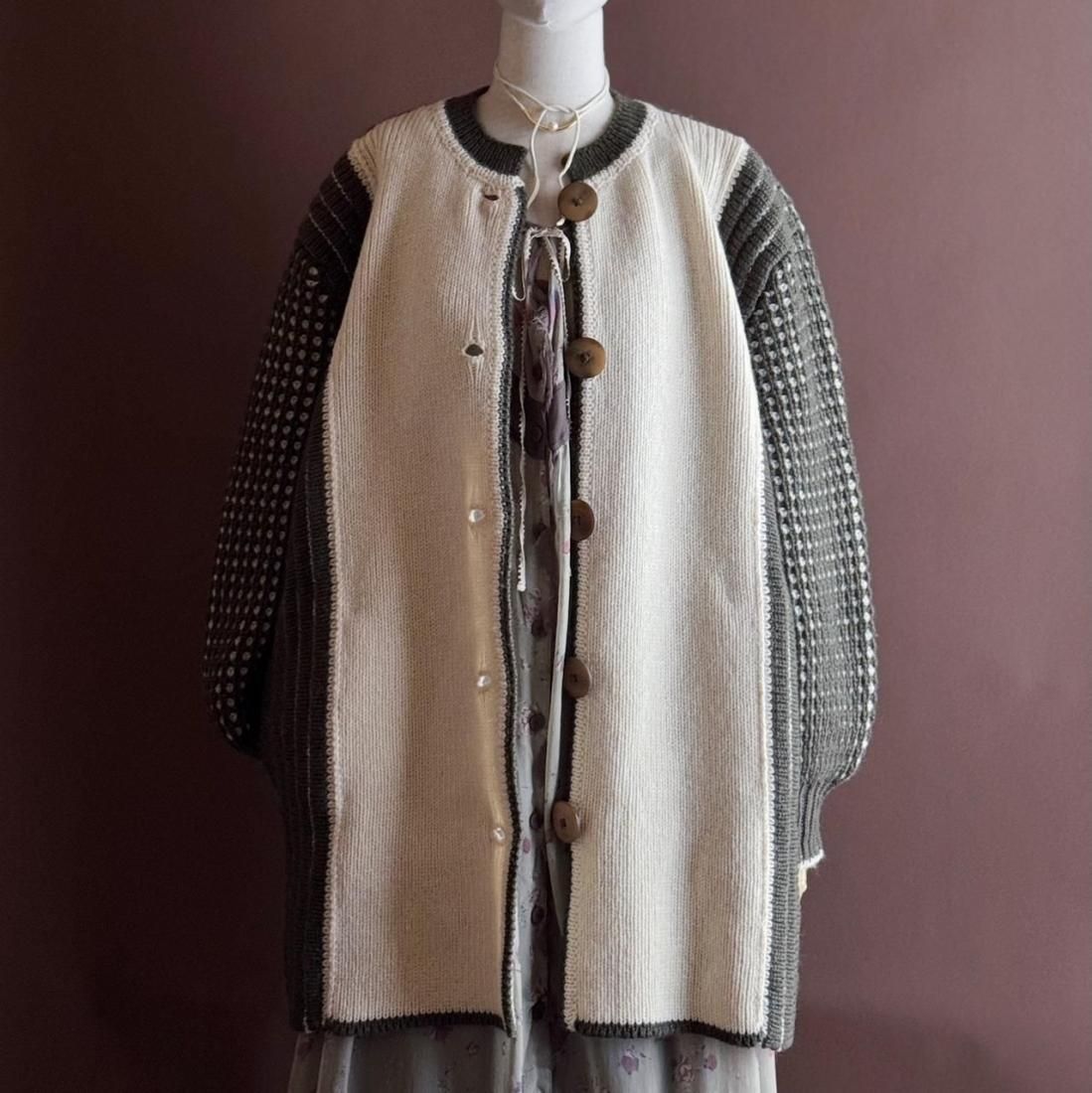 ざっくりと編み込まれたニットの質感、大きなボタン使いが素敵なニットカーディガン。