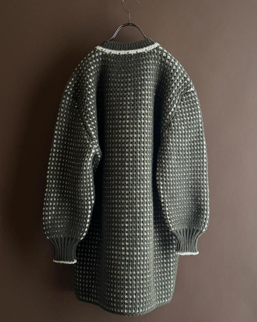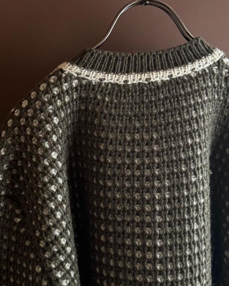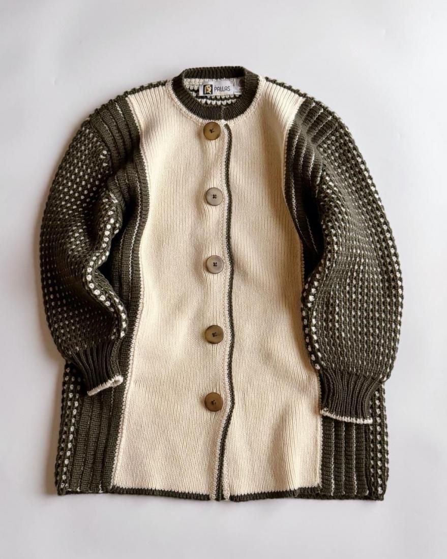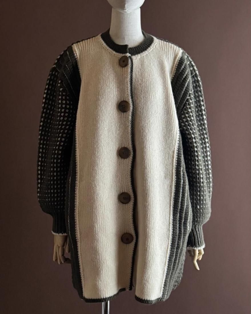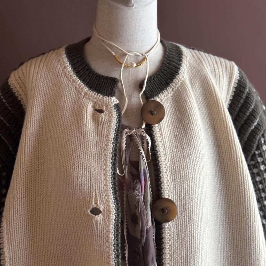 ざっくりと編み込まれたニットの質感、大きなボタン使いが素敵なニットカーディガン。