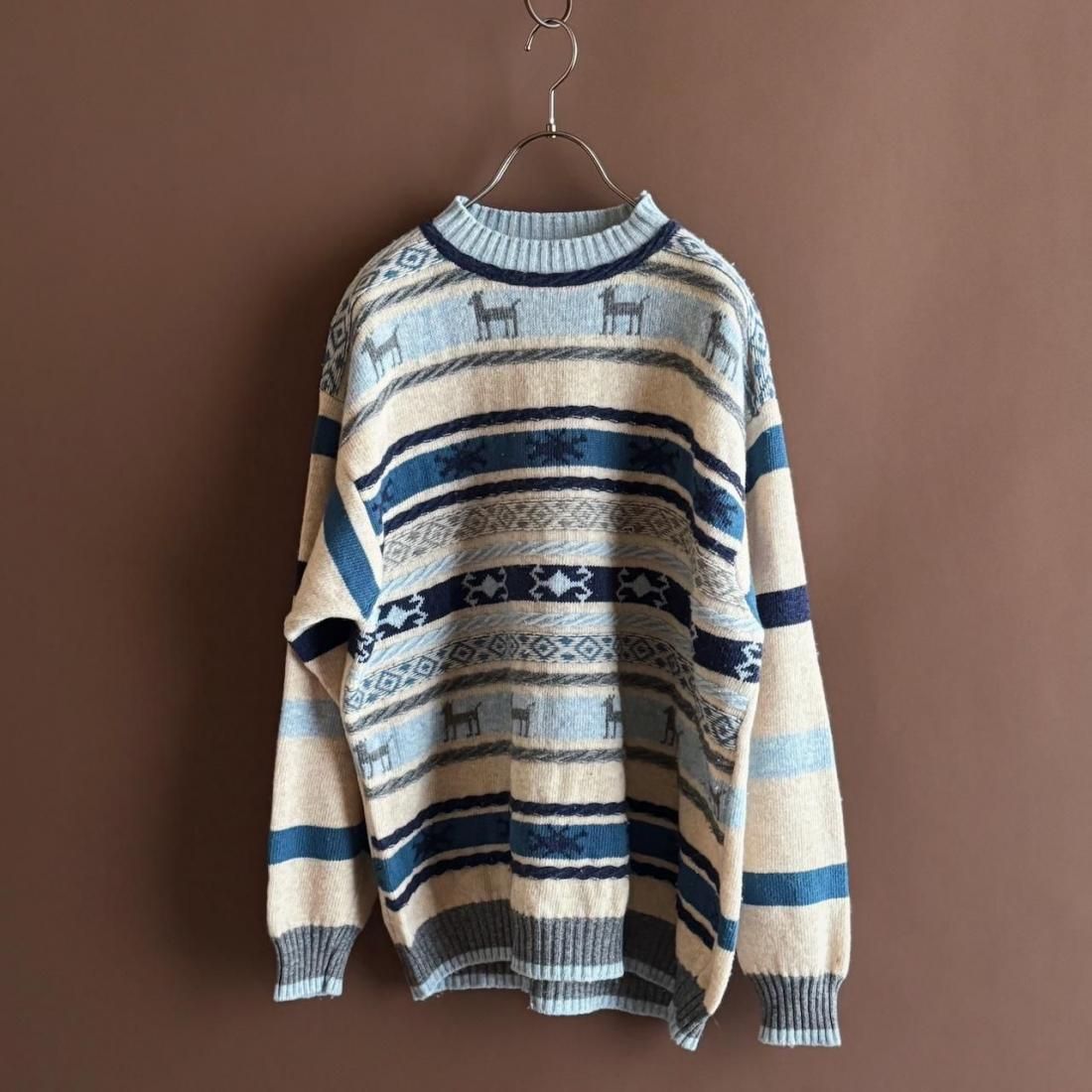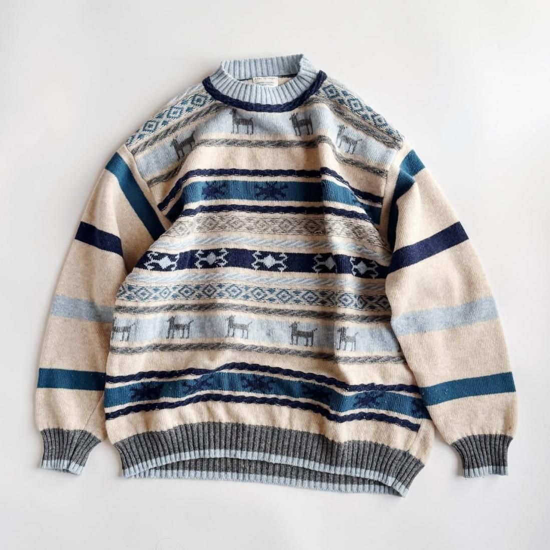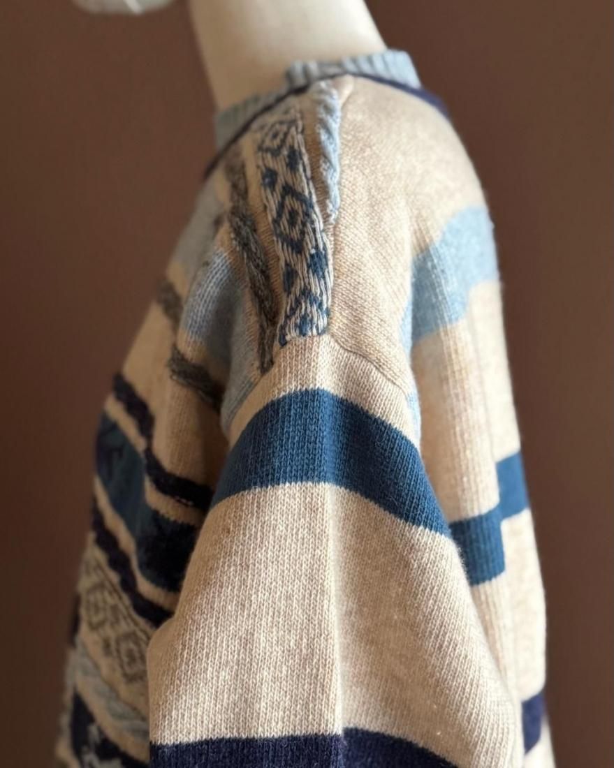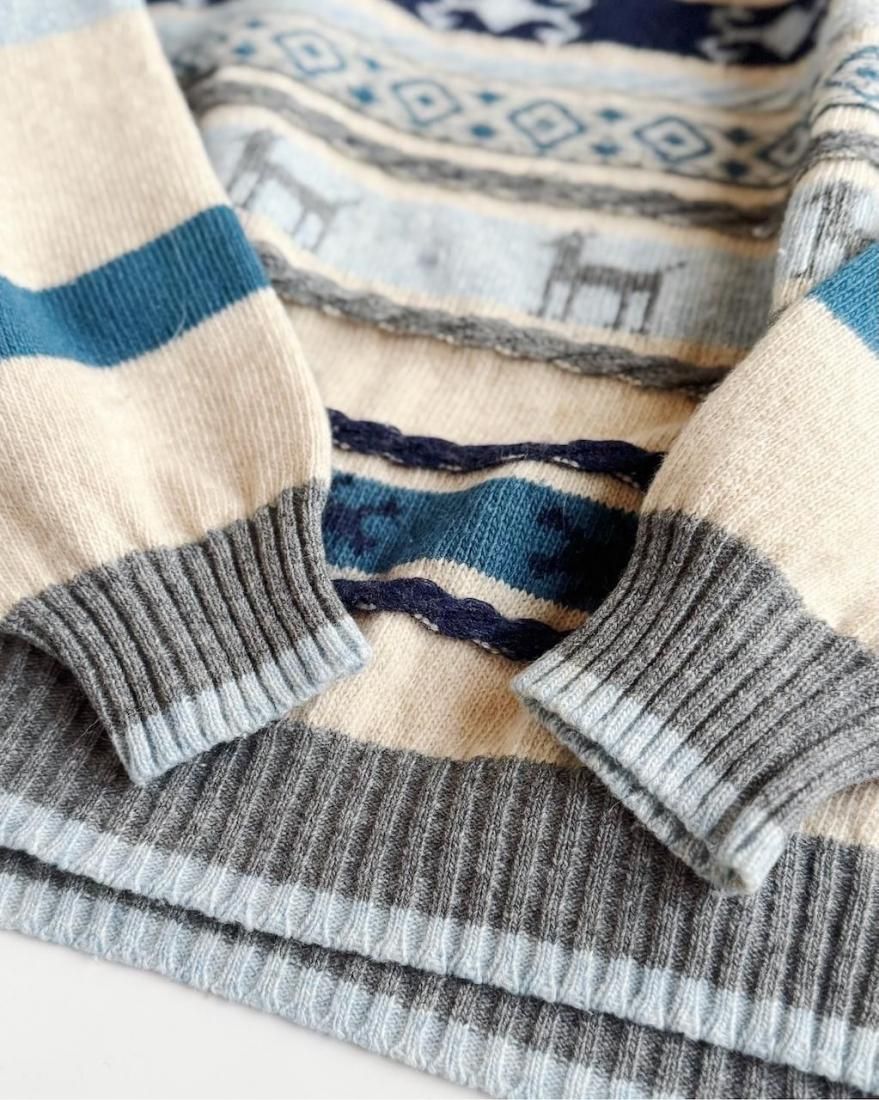 ベージュ、ライトブルー、ターコイズブルーなどの爽やかな配色+フォークロアなデザインが素敵なニット。