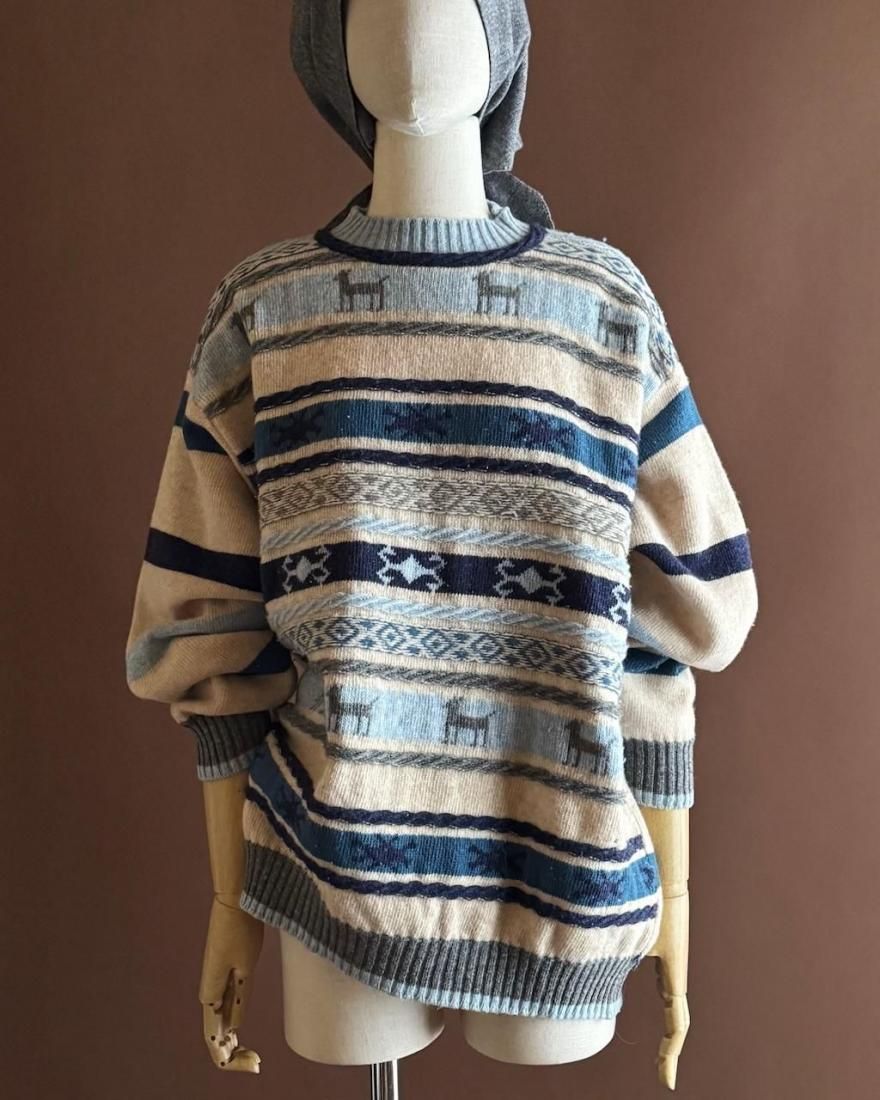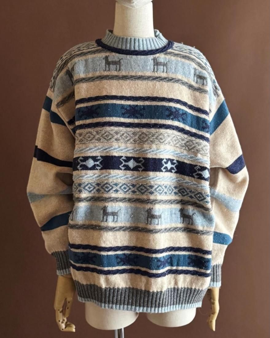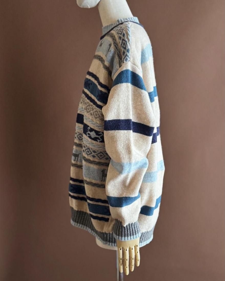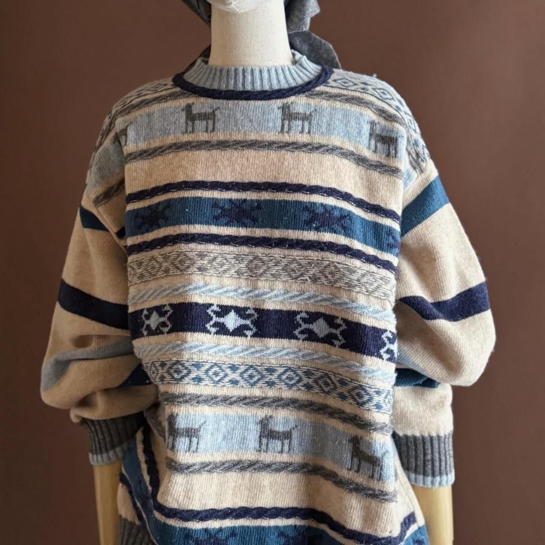ベージュ、ライトブルー、ターコイズブルーなどの爽やかな配色+フォークロアなデザインが素敵なニット。