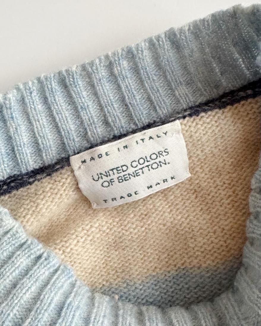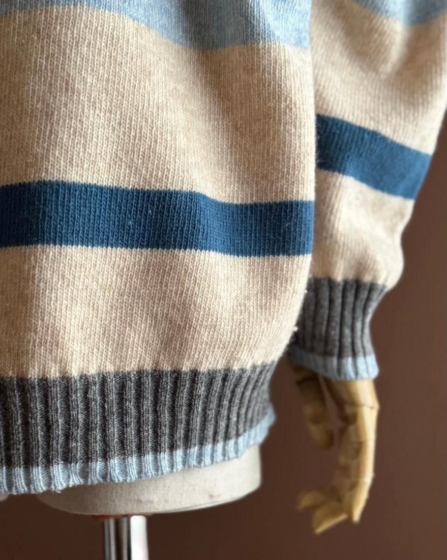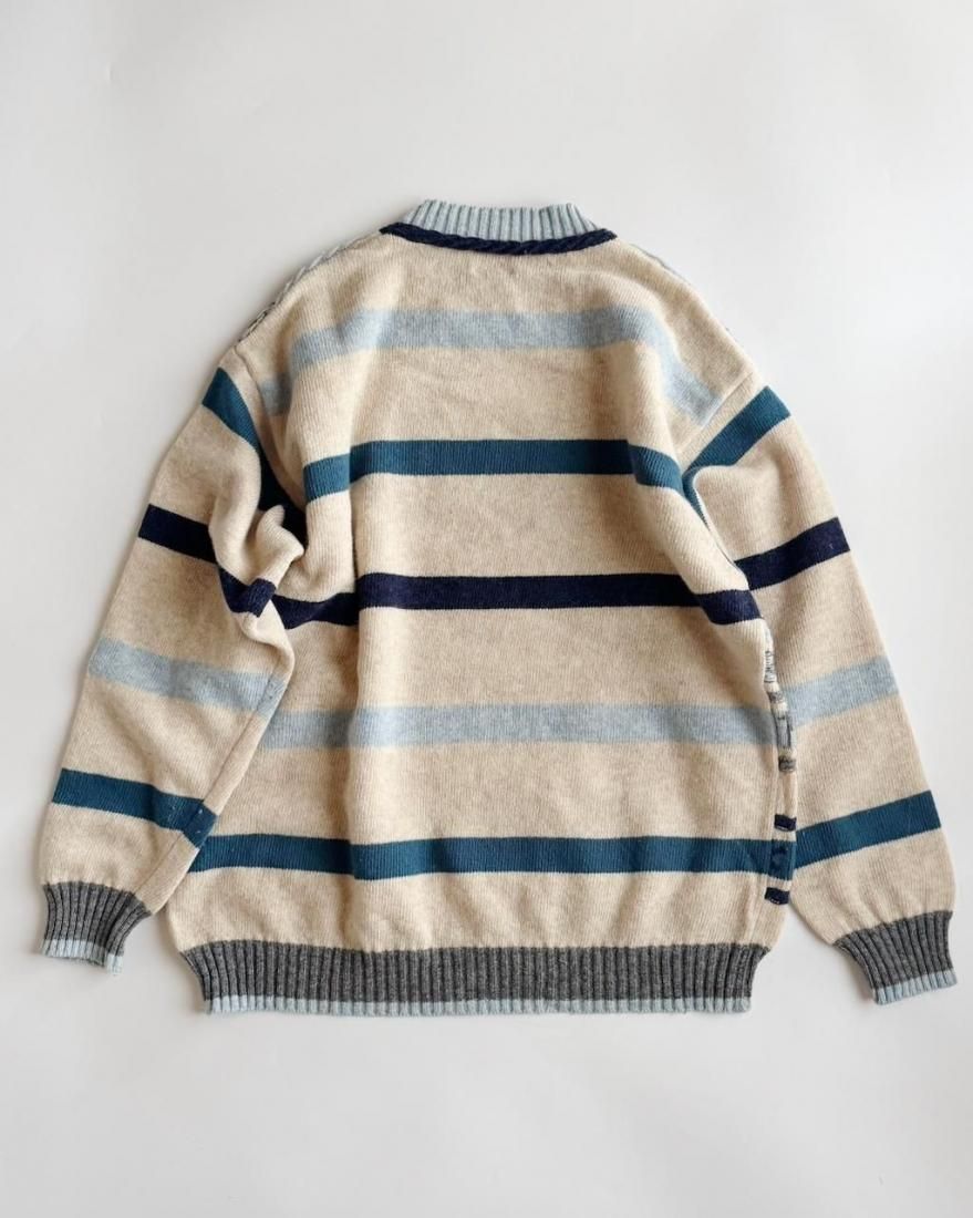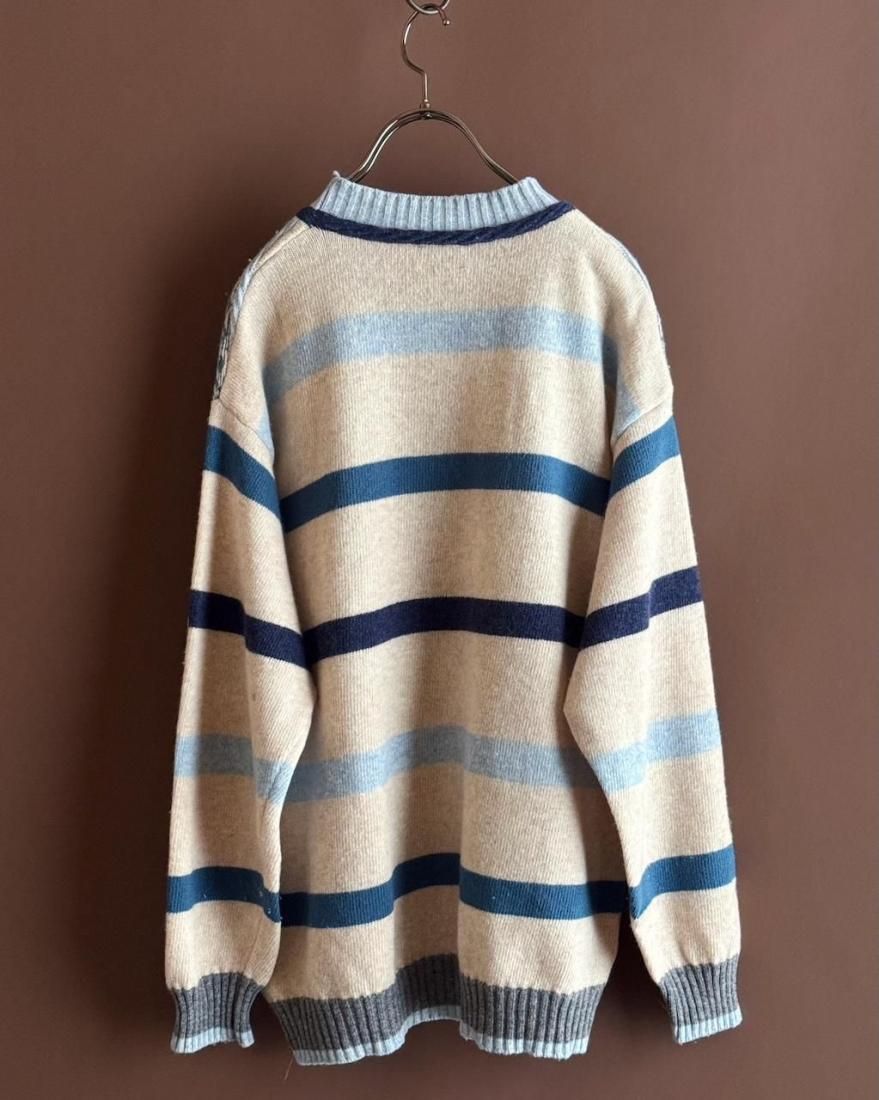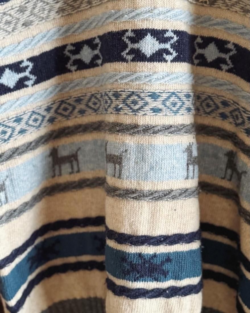ベージュ、ライトブルー、ターコイズブルーなどの爽やかな配色+フォークロアなデザインが素敵なニット。