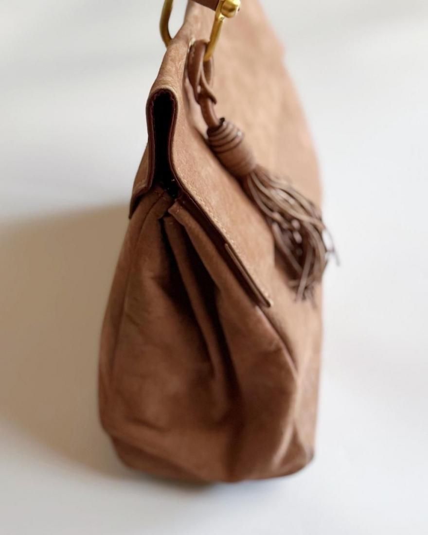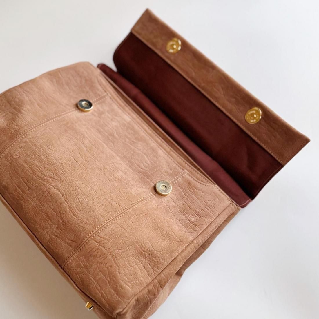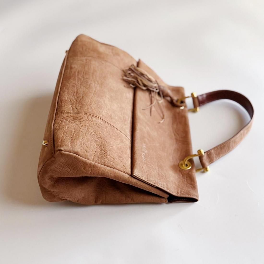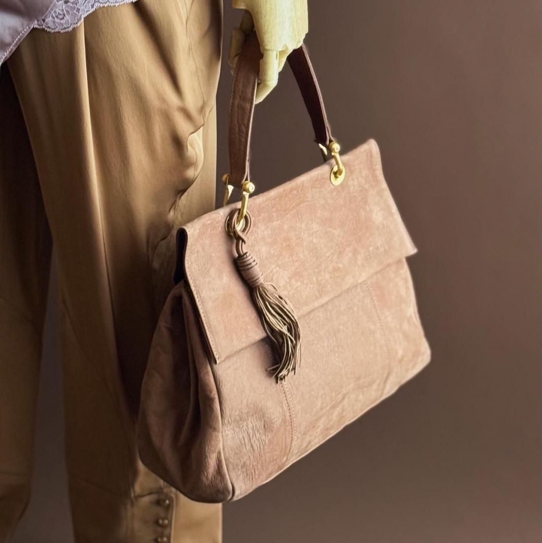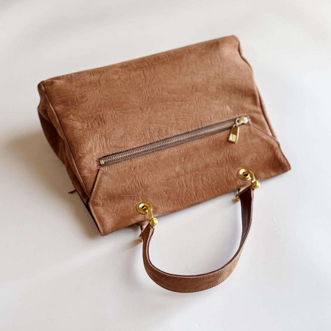 ベージュブラウンカラーのヌバックに型押ししたような独特の風合いがクラシックで素敵なハンドバッグ。