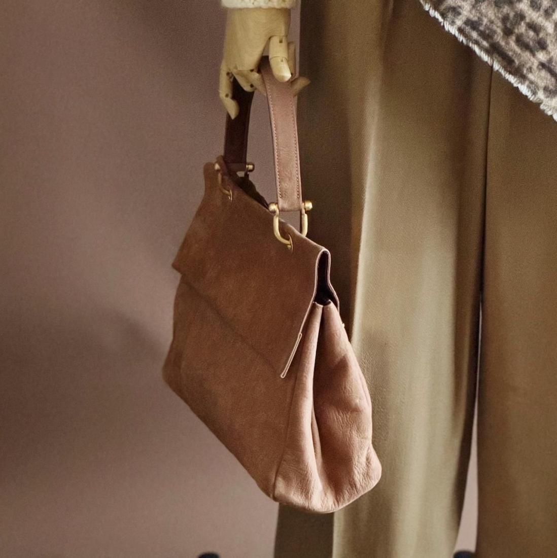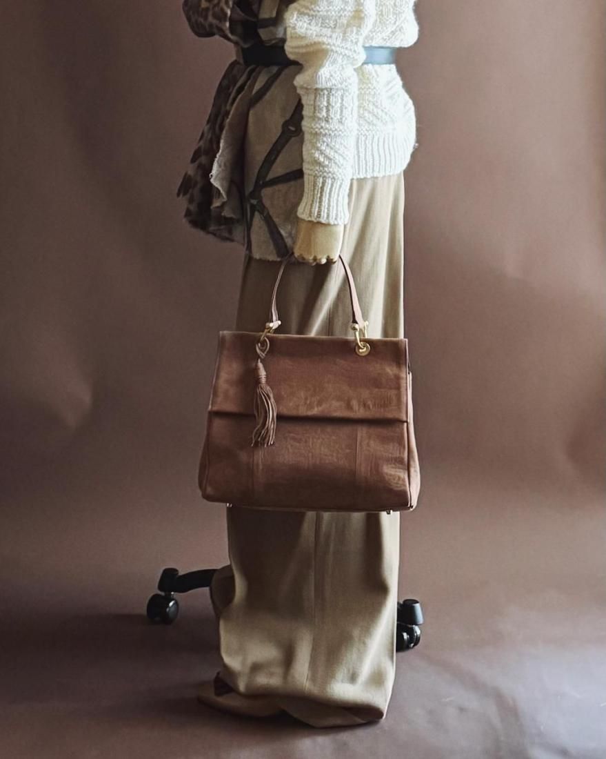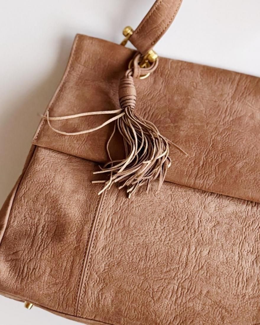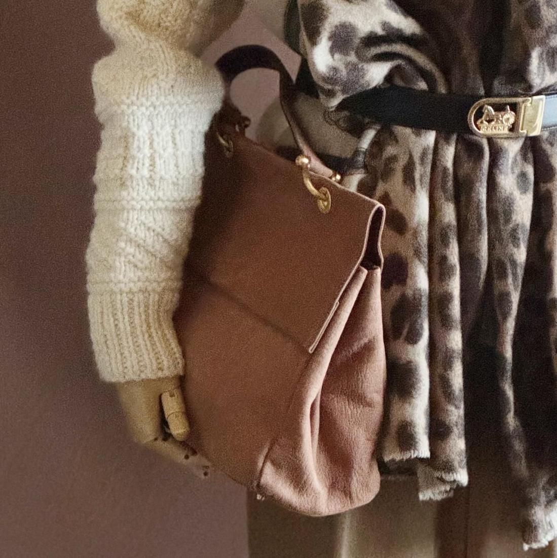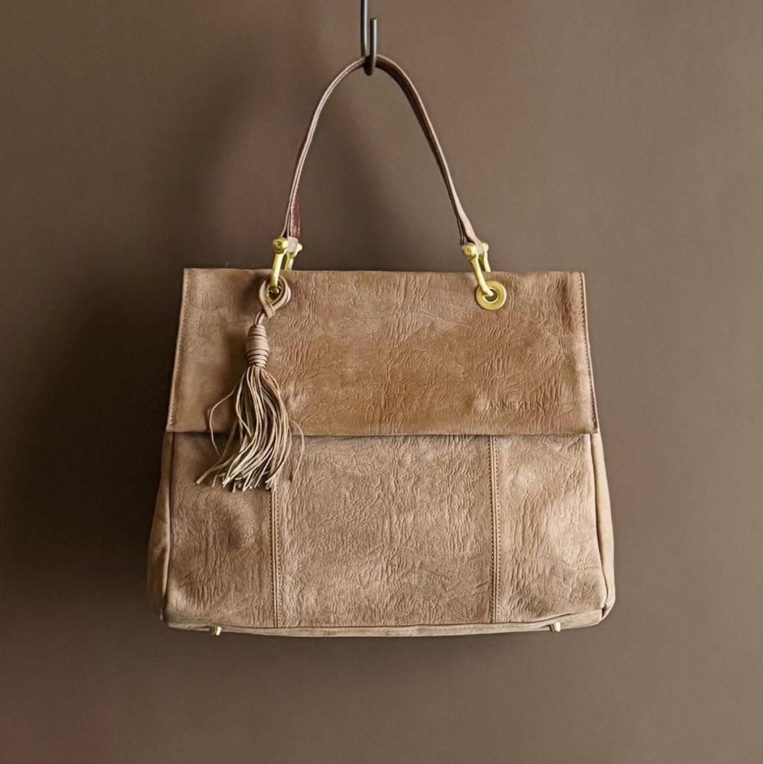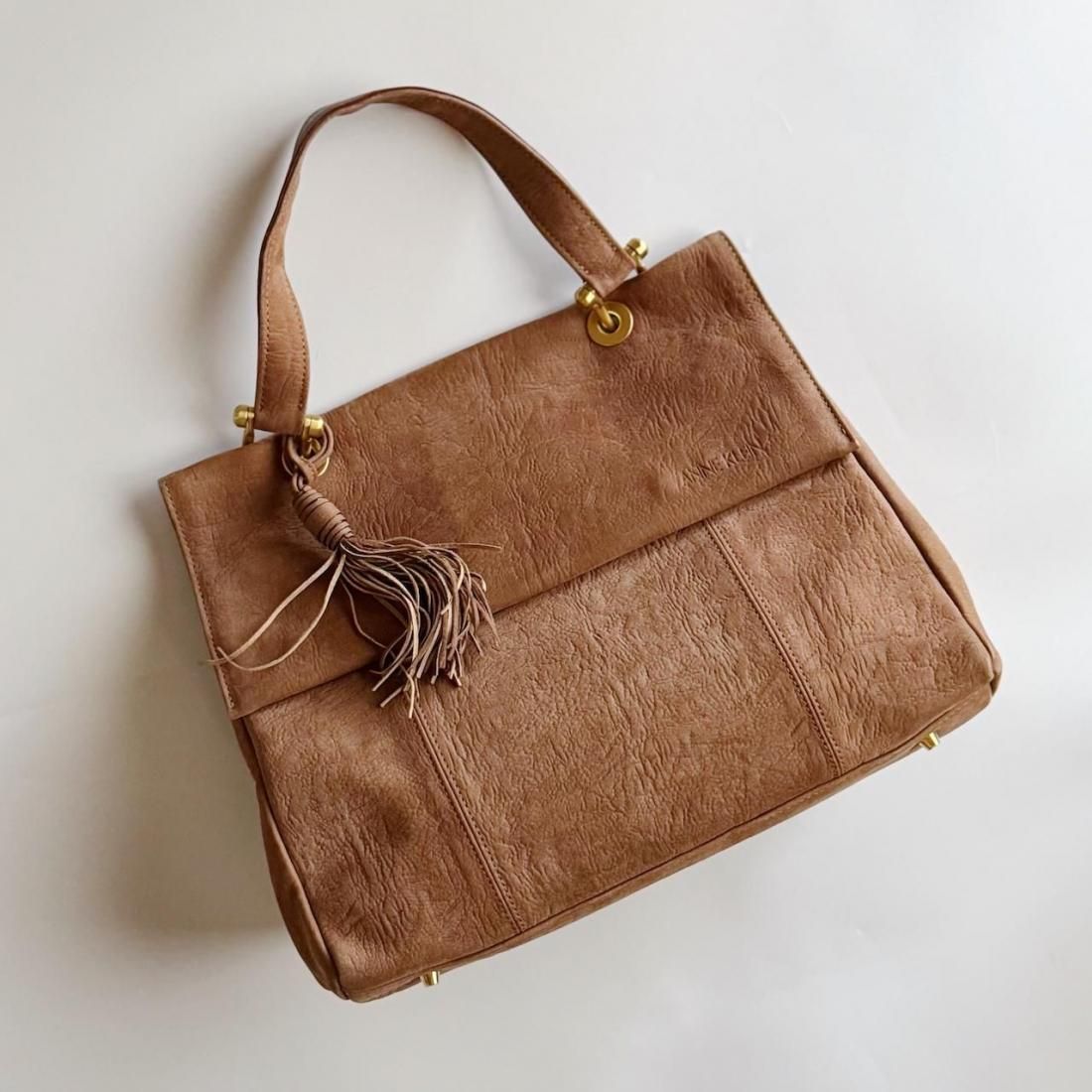 ベージュブラウンカラーのヌバックに型押ししたような独特の風合いがクラシックで素敵なハンドバッグ。