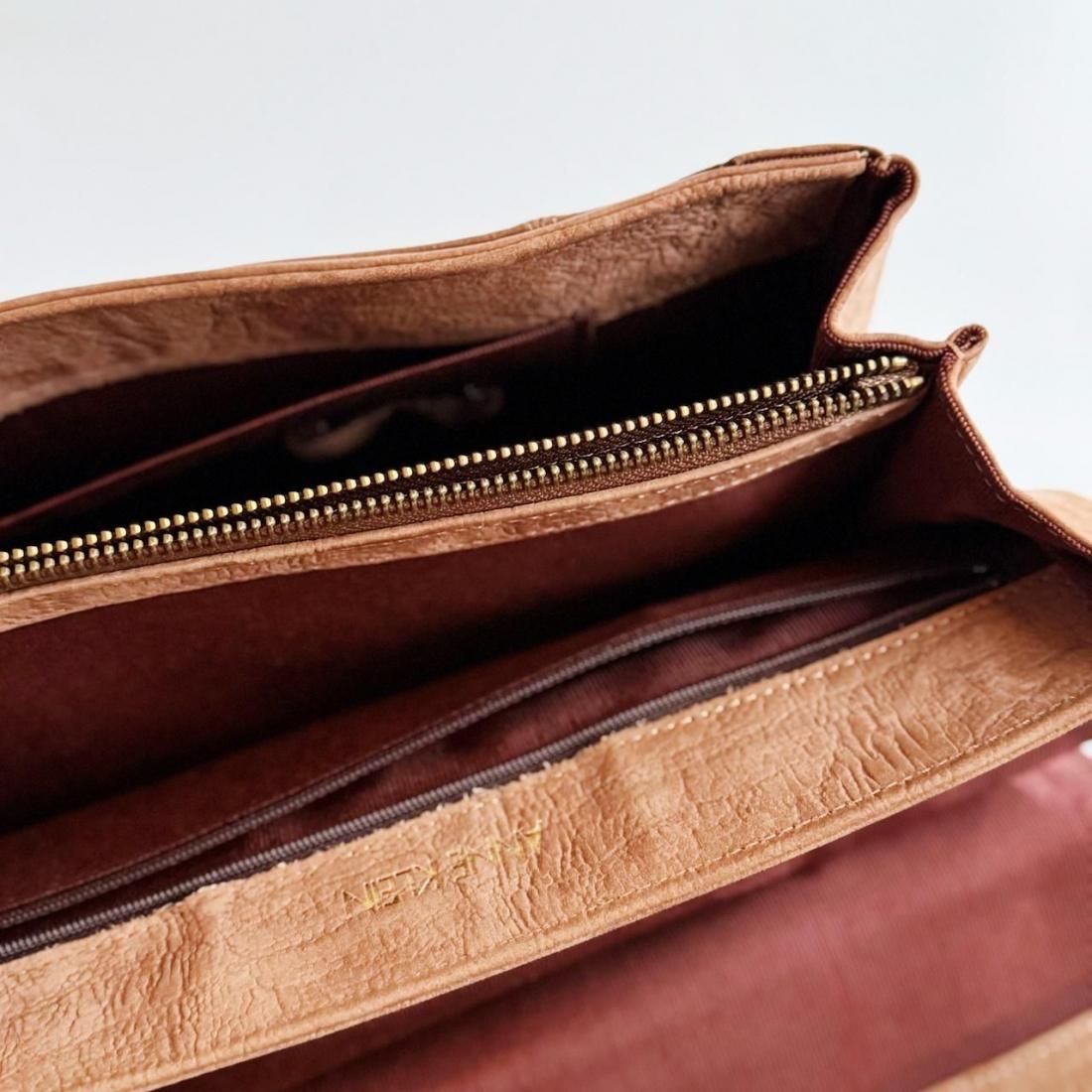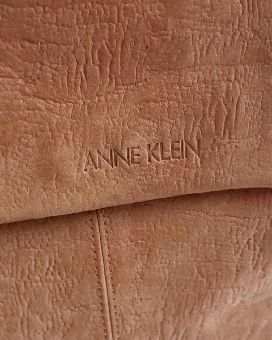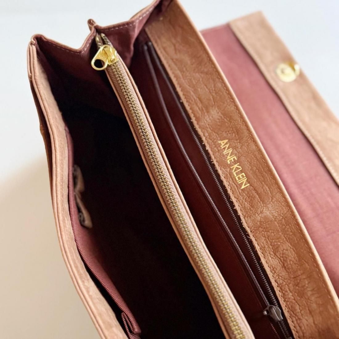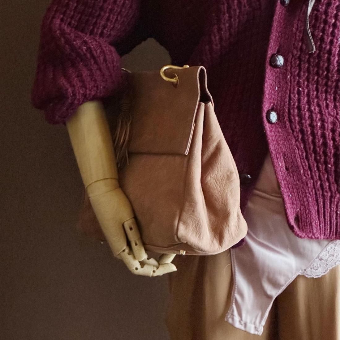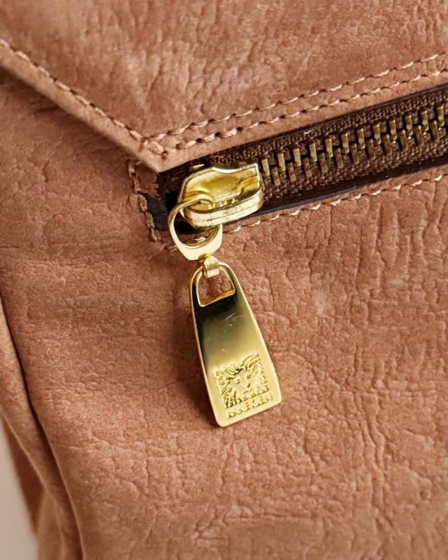 ベージュブラウンカラーのヌバックに型押ししたような独特の風合いがクラシックで素敵なハンドバッグ。