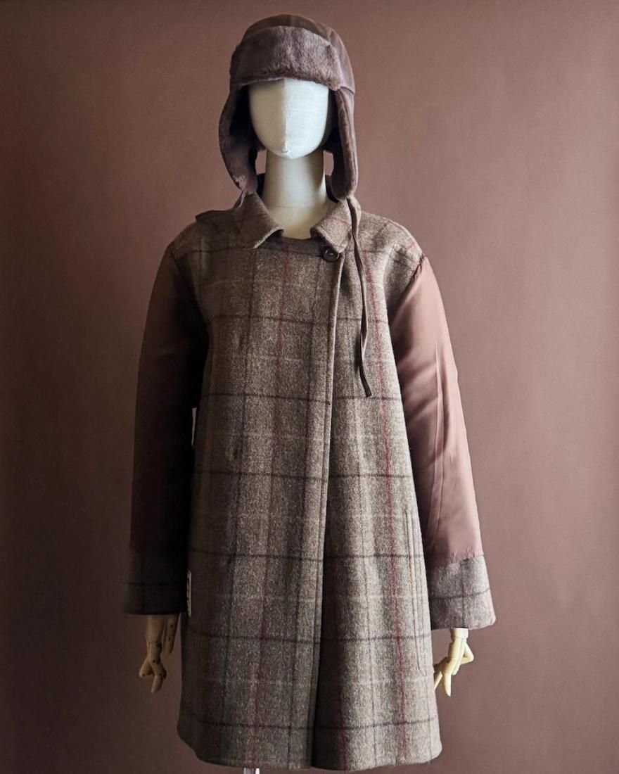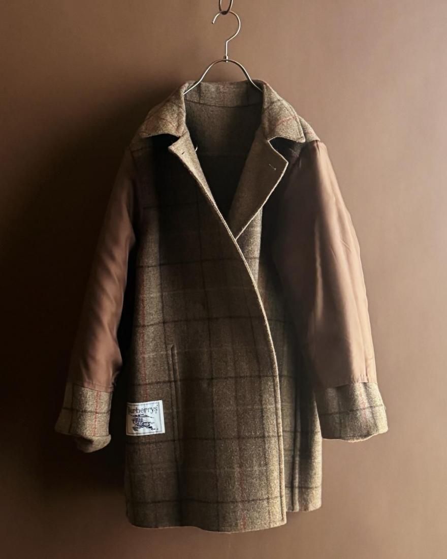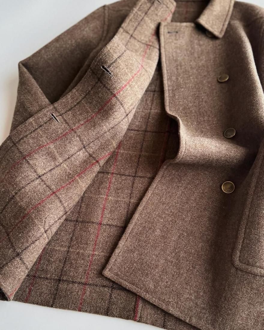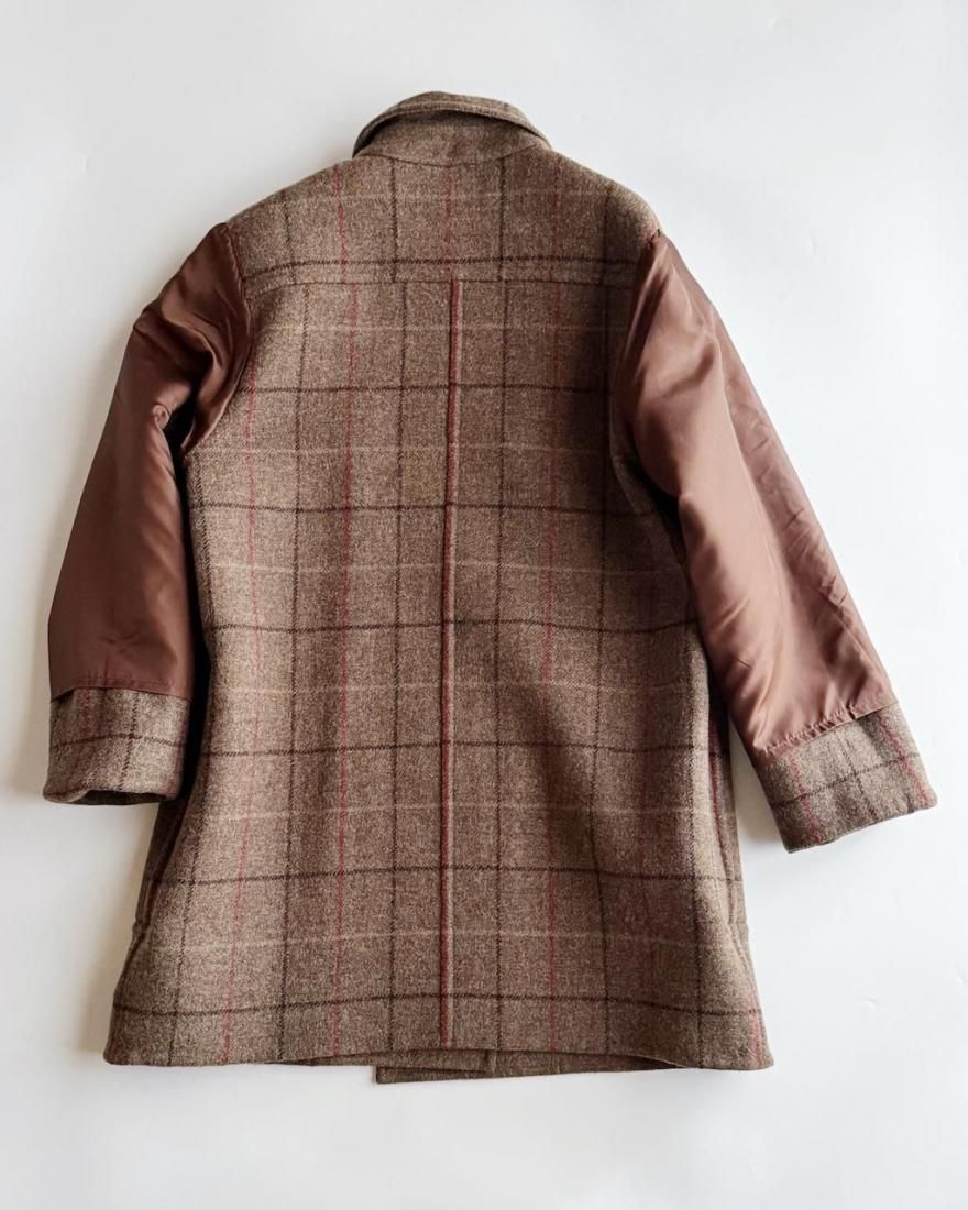 ダークブラウンカラーと裏地のチェック柄が今の気分にぴったりなリバーコート。